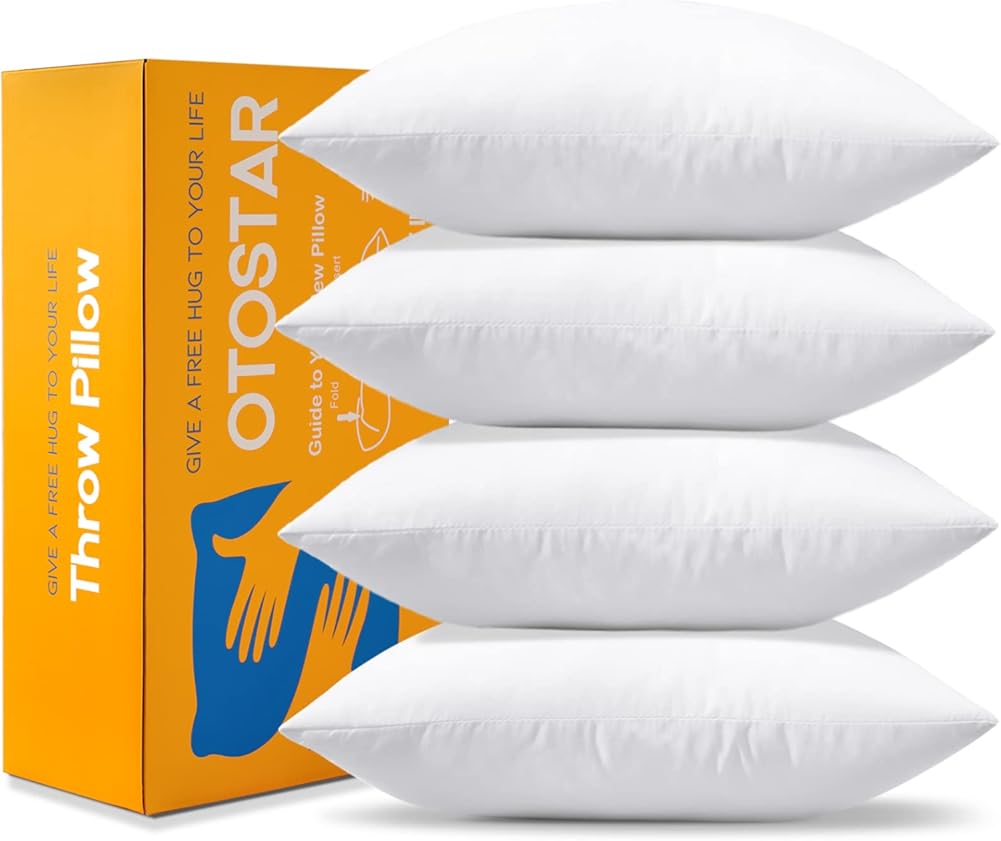 {"about_product": ["Material: Made of high-quality polyester fiber. The filler is made of great 7D PP material, soft and comfortable, better than common filler.", "Size: Each pillow insert is 18x18in/45x45cm. Because it's made by hand, there may be an error of 1-2cm.", "Multi-purpose: Set of 4 hypoallergenic throw pillow inserts for your home decoration. Hypoallergenic design is suitable for sofa, living room, bedroom, balcony, garden, farmhouse, patio, kitchen, office, etc.", "Warm Tips: The cushion insert is packed in vacuum compression. After opening the package, please follow the three methods in the instructions to make the pillow fluffy. It will create a wonderful rest time for you.", "Perfect Gift: Come with an exquisite gift box, it's a great gift for your family and friends."], "product_description": null, "product_information": {"ASIN": "B09S5H8DMT", "Size": "18x18 Inch (Pack of 4)", "Brand": "OTOSTAR", "Color": "White", "Shape": "Square", "Style": "18x18 Inch", "Theme": "Farmhouse", "Pattern": "Plain", "Unit Count": "4.0 Count", "Fabric Type": "Polyester Fiber", "Item Weight": "1 pounds", "Pillow Type": "Throw Pillow", "Manufacturer": "XiaMen Superior International Trading Co.,Ltd", "Fill Material": "Polyester", "Cover Material": "Polyester", "Item Thickness": "18 Centimeters", "Number of Items": "4", "Special Feature": "Back Support, Durable, Hypoallergenic", "Best Sellers Rank": "#18,542 in Home & Kitchen (See Top 100 in Home & Kitchen) #48 in Throw Pillow Inserts", "Item model number": "SG-X02-US", "Product Dimensions": "18\"L x 18\"W", "Date First Available": "February 10, 2022", "Indoor/Outdoor Usage": "Indoor", "Item Firmness Description": "Plush", "Product Care Instructions": "Hand Wash Only", "Recommended Uses For Product": "Home"}, "product_details": {"Size": "18x18 Inch (Pack of 4)", "Brand": "OTOSTAR", "Color": "White", "Pillow Type": "Throw Pillow", "Fill Material": "Polyester"}}