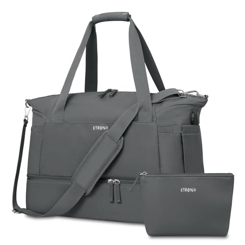 {"about_product": ["Multi-function Weekender Bag:Size:18*8.7*13.5 inches. With a USB port, this weekender bags for women provides easy access to charge your phone on the go. Large capacity and multiple pockets: 2 pockets and 1 large zippered wet bag inside. And this bag can store towels, cosmetics, iPad, clothes, food, drinks, etc. Two exterior side pockets to store a water bottle or umbrella. A large front pocket and a zippered back pocket for storing your small items", "Dry Wet Separate Duffel Bag:This duffle bag for women offers a spacious main compartment to store your clothes and items. A zippered waterproof PVC lined pocket for wet clothes or towels and swimsuits. In addition, this travel duffel bag also gives an extra small makeup bag for easy storage", "Separate Shoe Compartment with Vents:This personal item bag has a separate compartment on the bottom for your shoes and dirty clothes. And the shoe compartment has 2 vents to disperse the bad smell of shoes", "Firmly Made Construction & Removable Design:This carry on bag is made of water-resistant nylon to protect your items with high-quality zipper. The handles and adjustable, detachable shoulder straps have comfortable padding, which can reduce the pressure when carrying. There is a luggage strap on the back of this bag to facilitate your travel/business trip.", "Wide Application Gym Bag:A perfect choice for carrying all your gym and travel essentials. Use it as an personal item bag, luggage bag, gym bag, weekender bag, carry on bag, hospital bag, overnight bag. This bag is suitable for both indoor and outdoor activities, such as travel, sports, weekend trips, yoga, gym, beach, business or other daily use"], "product_description": null, "product_information": {"ASIN": "B09W2G325H", "Department": "unisex-adult", "Item Weight": "1.87 pounds", "Manufacturer": "ETRONIK", "Best Sellers Rank": "#1,807 in Clothing, Shoes & Jewelry (See Top 100 in Clothing, Shoes & Jewelry) #2 in Travel Duffel Bags", "Item model number": "JL123", "Product Dimensions": "18.5 x 8.7 x 14.2 inches", "Number of Compartments": "1"}, "product_details": {}}