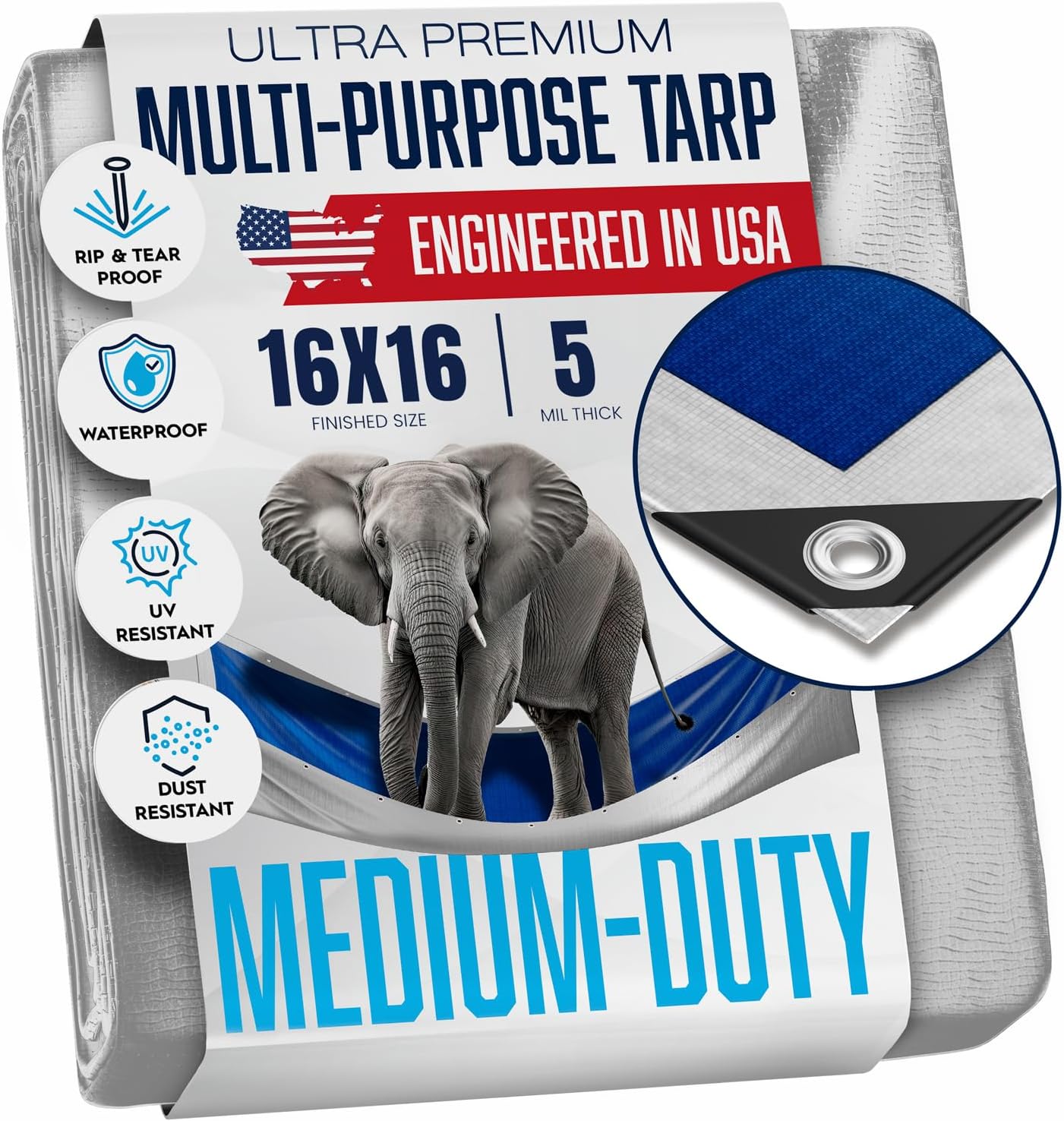 {"about_product": ["100% HAPPINESS GUARANTEED: We strive for excellence, we’re proud of each and every King-A-MA-JIGS product. Our mission is to provide our customers with products that exceed their expectations. On a few occasions that our customers aren’t fully satisfied, just contact us and we’ll refund the full amount of your purchase.", "LIGHTWEIGHT: An alternative to our more expensive, heavy duty tarps that are meant to last longer, this light to medium duty multipurpose tarp is a more affordable option. Unlike our competitors' products, even our economy tarps can withstand regular use.", "TARPS: Ideal tarp to bring on a hunting, backpacking, or outdoor camping trip, as it does not add too much carrying weight or bulk, and it could be used as an emergency shelter, blind, or ground cover. Stick it in the trunk of the car, in your camping gear or hunting backpack, or have close by to cover your tools, firewood, etc. during the rain.", "SPECIFICATIONS: 5.5 Mil Thick – Tarp Finish Size 16 x 16 Feet - Metal Grommets Every 18 Inches - Capped Reinforced Corners - Rope Reinforced Hems - Double Lamination", "FEATURES: Waterproof. Dustproof. Weather, & Tear Resistant - Sun Ultraviolet (UV) Resistant"], "product_description": null, "product_information": {"UPC": "850041456065", "ASIN": "B09ZFZRNPQ", "Size": "16'x16'", "Brand": "KING-A-MA-JIGS", "Color": "Blue, Silver", "Material": "Plastic", "Item Weight": "5.08 pounds", "Part Number": "mediumvariation", "Manufacturer": "KING-A-MA-JIGS", "Item Thickness": "5.5 Mils", "Number of Items": "1", "Special Features": "Waterproof", "Best Sellers Rank": "#30,297 in Tools & Home Improvement (See Top 100 in Tools & Home Improvement) #123 in Tarps", "Item model number": "medium", "Product Dimensions": "10\"L x 15\"W", "Batteries Included?": "No", "Batteries Required?": "No", "Included Components": "16 x Medium-Duty Paracord, 5 x Waterproof Patch", "Date First Available": "March 24, 2022", "Water Resistance Level": "Waterproof", "Center To Center Spacing": "18 Inches", "Recommended Uses For Product": "Backpacking, Camping, Emergency Preparedness, Hunting", "Ultraviolet Light Protection": "True"}, "product_details": {"Brand": "KING-A-MA-JIGS", "Color": "Blue, Silver", "Material": "Plastic", "Item Weight": "2.31 Kilograms", "Item Thickness": "5.5 Mils", "Number of Items": "1", "Product Dimensions": "10"L x 15"W", "Included Components": "16 x Medium-Duty Paracord, 5 x Waterproof Patch", "Water Resistance Level": "Waterproof", "Recommended Uses For Product": "Backpacking, Camping, Emergency Preparedness, Hunting"}}