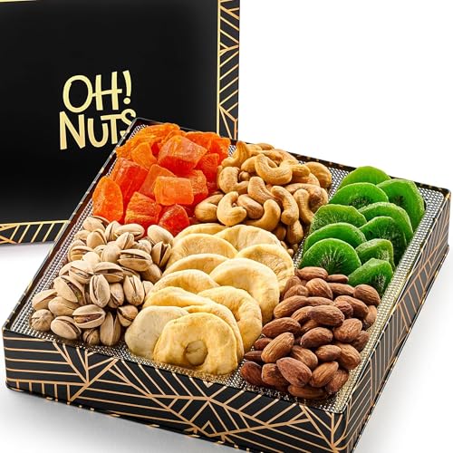 {"about_product": ["GIFT BASKET: Mixed Nuts & Dried Fruits - A perfectly balanced blend of crunchy nuts and naturally sweet dried fruits, offering a delicious and nutritious treat for everyone to enjoy this New Year’s holiday.", "ELEGANT GIFT TIN BOX: Treat your loved ones to a selection of premium fruits and nuts including Apricot, Cashew, Plums, Honey Pecans, Dates, Apples, and Almonds, all nestled in a reusable, lidded tin. This blend of flavors offers both beauty and taste in one delightful presentation.", "FRESHLY CRAFTED IN SMALL BATCHES: All the fruits and nuts are perfectly crafted to enhance their flavor. The process imparts a specific rich exotic flavor to these fruits and nuts, which makes them sweet and enticing to eat.", "FRUITS AND NUTS CANDY GIFTS: If you are looking for premium dried fruits and nuts, or holiday gifts, we have all of them and so much more. Browse our entire collection of Oh Nuts products to see what else is delicious in the snack aisle.", "REMEMBER TO CHECK THIS BOX \"This is a gift\": It's the people, gifts, and messages that make the moment memorable. Be sure to tell your special someone that you sent this as a gift by checking this box."], "product_description": null, "product_information": {"ASIN": "B0B51TFMCM", "Units": "1.0 Count", "Manufacturer": "Oh! Nuts", "Customer Reviews": "4.5 4.5 out of 5 stars \n\n (331)", "Best Sellers Rank": "#2,447 in Grocery & Gourmet Food (See Top 100 in Grocery & Gourmet Food) #24 in Fruit & Nut Gifts", "Product Dimensions": "1.5 x 4.5 x 4.46 inches; 2.51 Pounds"}, "product_details": {"Brand": "Oh! Nuts", "Flavor": "Apple", "Cuisine": "Mixed", "Number of Items": "7", "Package Information": "Box,Packaging,Tin,Tin Box"}}