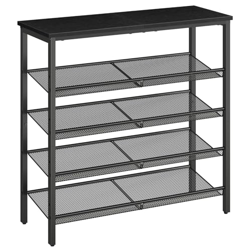 {"about_product": ["Organized Shoe Storage: This shoe rack restores order to your home with five shelves (including the top shelf) holding 16-20 pairs of shoes(depends on shoe size and type), ensuring a tidy display of your footwear and banishing chaos from corners", "Collision of Black and Brown: Matte black frame is smooth and exquisite while the retro brown finish is noble and delicate, making this shoe organizer a perfect match to your home decorations and a charming spot for your family and friends", "Flexible Tilting and Leveling: Besides a spacious top, this shoe rack has metal mesh shelves to be tilted or leveled as per your preference, catering to diverse storage needs. How to store heels or tall boots? Removable design helps you", "Solid, Stable, Safe: This shoe rack is constructed of premium particleboard and metal mesh shelves. The top loads up to 44 lb and each mesh bears up to 22 lb, so you can enjoy safe use of this shoe rack. Of course you can expect long serviceability because the frame is hard to bent and age", "No Hassle Assembly: We pay special attention to the customer’s product experience, including assembly experience. So we specially improved the assemble method and procedures of the product"], "product_description": null, "product_information": {"ASIN": "B0B9N51B6G", "Size": "29.5\"W x 11.8\"D x 31.8\"H", "Brand": "HOOBRO", "Color": "Rustic Brown + Black", "Style": "Modern", "Room Type": "Bedroom, Closet, Garage, Hallway, Living Room", "Unit Count": "1.0 Count", "Finish Type": "Matte", "Item Weight": "15.6 pounds", "Manufacturer": "HOOBRO", "Product Name": "Shoe Rack", "Weight Limit": "44 Pounds", "Number of Items": "1", "Shelf Thickness": "6.36 Inches", "Special Feature": "Adjustable, Detachable, Durable", "Weight capacity": "Minimum weight: 22 Pounds", "Furniture Finish": "Brown", "Assembly Required": "Yes", "Best Sellers Rank": "#5,429 in Home & Kitchen (See Top 100 in Home & Kitchen) #9 in Free Standing Shoe Racks", "Installation Type": "Freestanding", "Item model number": "BF12XJ01", "Number of Shelves": "5", "Product Dimensions": "11.8\"D x 29.5\"W x 31.8\"H", "Shelf Bracket Shape": "Rectangular", "Date First Available": "August 15, 2022", "Product Care Instructions": "Wipe with Dry Cloth", "Specific Uses For Product": "Clothes, Plants, Shoes", "Recommended Uses For Product": "Corner, Home Decor, Storage", "Assembly Instructions Description": "The product requires assembly. Detailed instructions and accompanying installation tools are included for easy setup."}, "product_details": {"Shape": "Rectangular", "Style": "Modern", "Material": "Engineered Wood, Metal", "Room Type": "Bedroom, Closet, Garage, Hallway, Living Room", "Shelf Type": "Tiered Shelf", "Finish Type": "Matte", "Mounting Type": "Floor Mount", "Special Feature": "Adjustable, Detachable, Durable", "Number of Shelves": "5", "Product Dimensions": "11.8"D x 29.5"W x 31.8"H"}}