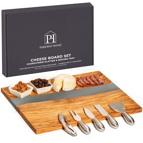 {"about_product": ["? Set a Showstopping Table: Why settle for bland, boring serving trays? Dazzle your dinner and party guests with our Charcuterie Meat and Cheese Platter, imported directly from Italy; Handcrafted by highly skilled artisans, it's a one-of-a-kind work of art, certain to elevate any event or occasion; No two are exactly alike!", "? Only the Finest Materials: What gives this decorative cheeseboard its distinctive charm? It's made of genuine Italian olive wood, famous for rock-hard strength, richly patterned grain, and gorgeous golden hues; Plus, it's adorned with unique resin artwork depicting a beautiful river; Choose from 4 resin colors: Black, Blue, Gray, and White Pearl", "? Includes Must-Have Charcuterie Accessories: Unlike most resin/olive wood trays, our cheese and meat cutting board comes with all the utensils you'll need: 2 dip bowls, 1 wine corkscrew, plus 1 cheese knife set for charcuterie board with 4 sterling-silver knives; You even get a printed full-color guide to gourmet wines and cheeses", "? Endlessly Versatile and Giftable: Use our elegant wooden cutting board to serve mouthwatering meats and cheeses, but don't stop there; It's also a perfect carving board, butter board, dessert tray, veggie tray, appetizer serving tray, and chip and dip serving set; Plus, it makes a much-appreciated gift for holidays, housewarmings, and more", "✅ We Stand Behind Every Set We Sell: Let’s face it, most charcuterie boards look alike – and the few that do look different are missing crucial accessories; That’s why we designed this unique cheese board set, combining exquisite artistry with 7 charcuterie utensils; Spot a problem within 1 year? Let us know, and we'll make it right!"], "product_description": null, "product_information": {"UPC": "196852120086", "ASIN": "B0B9NFZNML", "Size": "15.75 inches x 11.8 inches", "Brand": "Parkway Home", "Color": "Gray", "Shape": "Rectangular", "Material": "Olive Wood", "Item Weight": "5.55 pounds", "Number of Items": "8", "Best Sellers Rank": "#19,450 in Kitchen & Dining (See Top 100 in Kitchen & Dining) #341 in Cutting Boards", "Item model number": "Olive Wood Cheese Board Set, Gray", "Product Dimensions": "15.75\"L x 11.8\"W x 0.6\"Th", "Included Components": "2 Ceramic Dishes, Cheese Guide, Cheese Utensils, Wine Opener", "Date First Available": "November 9, 2022", "Product Care Instructions": "Hand Wash Only", "Recommended Uses For Product": "Food"}, "product_details": {"Size": "15.75 inches x 11.8 inches", "Brand": "Parkway Home", "Color": "Gray", "Shape": "Rectangular", "Material": "Olive Wood", "Number of Items": "8", "Product Dimensions": "15.75"L x 11.8"W x 0.6"Th", "Included Components": "2 Ceramic Dishes, Cheese Guide, Cheese Utensils, Wine Opener", "Product Care Instructions": "Hand Wash Only", "Recommended Uses For Product": "Food"}}