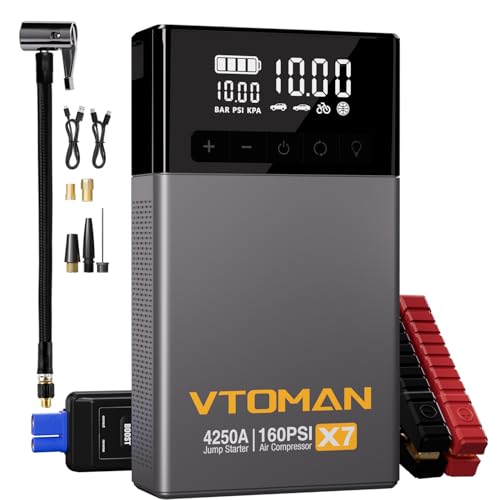 {"about_product": ["UNMATCHED STARTUP PERFORMANCE : The X7 jump starter boasts a peak cranking current of up to 4250A and a high-capacity battery, making it ideal for heavy-duty vehicles such as pickup, trucks, SUVs, and marine vehicles, also for regular cars, bicycles, balls, pool floats, and air mattresses(Not for SUPs).The X7 battery starter is able to start all 12V vehicles (10L Gas/10L Diesel engines) up to 70 times at once. Additionally, our X7 battery jump starter features a BOOST function, allowing continued use even with a completely discharged battery", "INTELLIGENT DIGITAL TIRE INFLATOR:The X7 car jump starter is equipped with a 5.1-inch smart screen and tire pressure detection function to make your operation more convenient.The jumper starter battery pack supports 3 optional units (PSI, BAR, KPA). VTOMAN X7 air pump fills a 30” tire in 1 minute (30-35 PSI), gauge accuracy +/-1 PSI, 160 PSI Max", "5.1-INCH LARGE INTELLIGENT DISPLAY: A user-friendly 5.1-inch smart screen provides you with important data such as battery level, inflator mode and real-time tire pressure, making it easier and clearer to use the X7 battery jumper starter portable", "MULTIPLE PROTECTION:The upgraded smart chip of the X7 jump starter battery pack makes it easy and fast to start the car in extreme environments (-4°F to 140°F), with 10 built-in safety protection technologies(over-charge, over-current, short-circuit, reverse-polarity, low-temp, high-temp, over-voltage, over-load, spark-proof, reverse-charge)", "UPGRADED THERMAL DESIGN:The unique honeycomb heat dissipation design enables the X7 car battery booster to obtain more powerful heat dissipation performance, so the safety performance of the X7 car starter is Enhanced by 30%, and its service life is promoted by 50%", "MORE THAN A JUMP STARTER: X7 is not only jump box, power bank, Tire Inflator, LED flashlight, but it also supports 18W Type-c fast charging. The X7 jump pack takes just ten minutes to charge to fully inflate a tire. In addition, the 400-lumen LED light equipped with the X7 battery starter supports 3 lighting modes: constant lighting (white), flash(red) and SOS(red)", "WHAT YOU GET: 1 X jump starter with air compressor, 1 X smart jumper cable, 1 X USB-A to USB-C cable, 1 X USB-C to USB-C cable, 1 X carrying bag, 1 X pump tube, 5 X air nozzle, 1 X user manual, 18 months warranty and lifetime tech support. If you have any after-sales questions about jump starter, please feel free to contact us", "Note: Please do not use the air pump function continuously. When the tire battery compressor is seriously hot, please cool down for a few minutes before continuing to inflate the tire", "*Note:Type-C is the only input charging port. The DC output port is used to power car products such as car vacuum cleaners, not an iutput port. Please use type-C cable to charge. Improper charging may cause safety issues. *Note: Please use a certified standard charger for charging"], "product_description": null, "product_information": {"ASIN": "B0BBG7RZTN", "Brand": "VTOMAN", "Model": "X7", "Amperage": "4250 Amps", "Exterior": "Machined", "Batteries": "1 Lithium Polymer batteries required.", "Bulb Type": "LED", "Item Weight": "3.3 pounds", "Manufacturer": "VTOMAN", "Special Features": "400 Lumen LED Flashlight, 4250A 12V Portable Lithium Car Battery Jump Starter, 4250A Car Starter, 5.1-inch Large Intelligent Display Screen, Fast Charging, Intelligent Digital Tire Inflator, Jump Starter with Air Compressor, Portable Power Bank for USB Devices, Reverse Polarity and Spark-Proof Protection, Safety Protection: Over-charge, Over-current, Short-circuit, Reverse Polarity, Low-temp, High-temp, Over-voltage, Over-load", "Best Sellers Rank": "#1,418 in Automotive (See Top 100 in Automotive) #60 in Jump Starters", "Item model number": "X7", "Specification Met": "FCC, UL", "Product Dimensions": "5.12\"D x 1.97\"W x 9.06\"H", "Peak Output Current": "4250 Amps", "Date First Available": "November 30, 2022", "Manufacturer Part Number": "Epower-325"}, "product_details": {"Brand": "VTOMAN", "Voltage": "12 Volts", "Product Dimensions": "5.12"D x 1.97"W x 9.06"H", "Vehicle Service Type": "Passenger Car, ATV, Motorcycle, Van, RV, UTV, Truck, Watercraft, Tractor", "Battery Cell Composition": "Lithium Polymer"}}