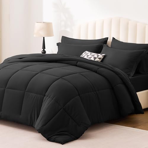 {"about_product": ["Soft and Lightweight - Our bedding comforter sets is made of premium fabric which is ultra soft, hypoallergenic, breathable and sweat-absorbent. The comforter is filled with 240gsm cloud-like down alternative, which is thick enough to keep you warm but it's also fairly light weight. Even in a cold place in winter, you only need to add another blanket, and don’t need to buy a new comforter. This comforter set is perfect for all season, we want you to be comfortable all year round", "Bedding in A Bag - You'll get all the bedding you need and won't need to spend extra time looking for something else to match your bedroom. And we porvide multi colors for you to choose. The 7 pieces queen comforter set includes 1 comforter (88\"x 88\"), 1 flat sheet (90\"x 102\"), 1 fitted sheet (60\"x 80\"x14\"), 2 pillowcase (20\"x 30\") and 2 pillow sham (20\"x 26\").", "Unique Design - The box stitching could prevent the comforter filling from shifting and bunching no matter how you twist and turn in your bed. This design makes this comforter last longer without having to change it frequently. Our fitted sheet has a elastic 14” deep pocket which will fit almost any mattress. The envelope closure pillowcases to keep your pillows secure and will not fall down in sleep.", "Easy to Care - Machine wash in the gentle cycle with cold water. Sun-dry or tumble dry on low heat. Do not bleach. Do not iron. Tips: Our comforter set is vacuum packaged, it will fluffy up nicely after airing it for a few hours or putting it into dryer on low for 15-20 mins.", "No Risk Shopping - if you have any problem about our product, please feel free to contact us for an exchange or refund. Love's cabin strives to provide 1-Month return and replacement service & life-time free customer service. We want our customers to be 100% happy and satisfied!"], "product_description": null, "product_information": {"ASIN": "B0BC91YVXF", "Size": "Queen", "Brand": "Love's cabin", "Color": "Black", "Style": "Modern", "Theme": "Comforter Set", "Pattern": "Solid", "Seasons": "All", "Material": "Polyester", "Unit Count": "1.0 Count", "Item Weight": "9.21 pounds", "Manufacturer": "Love's cabin", "Thread Count": "1800", "Sham Quantity": "2", "Number of Pieces": "7", "Pillowcase Width": "20 Inches", "Best Sellers Rank": "#224 in Home & Kitchen (See Top 100 in Home & Kitchen) #3 in Bedding Comforter Sets", "Item model number": "C-USA22A1PJTE09QU", "Pillowcase Length": "20 Inches", "Product Dimensions": "80 x 60 x 14 inches", "Included Components": "1 comforter, 1 flat sheet, 1 fitted sheet, 2 pillowcases and 2 pillow shams", "Pillowcase Quantity": "2", "Date First Available": "October 31, 2022", "Item dimensions L x W x H": "80 x 60 x 14 inches", "Product Care Instructions": "Machine Wash"}, "product_details": {"Size": "Queen", "Brand": "Love's cabin", "Color": "Black", "Pattern": "Solid", "Material": "Polyester"}}