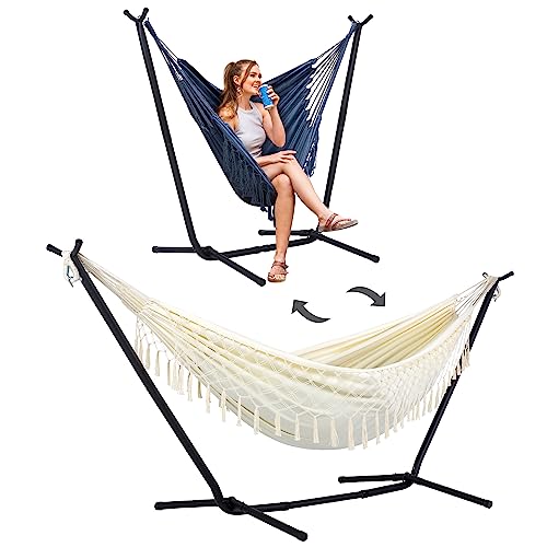 {"about_product": ["Double Enjoyment by Simple Adjustment: SUNCREAT patent pending 2-in-1 hammock stand could be adjusted to hammock chair stand by 2 steps. You will receive 1 double hammock bed, 1 hammock chair, and 1 convertible stand which can be adjusted to hammock stand or hammock chair stand. You could enjoy the double hammock with family or have fun on the hammock chair by your choice", "Upgraded Fabric (When Use with Hammock): SUNCREAT Brazilian Camping hammock is made of eco-friendly thicker version poly-cotton fabric (no lint, no odor, no pilling, no fading, skin-friendly, and breathable), stronger and much more durable than ordinary fabric hammocks. A comfortable cocoon style hammock can keep you safe while enjoying the peaceful leisure time. You can even set your preferred height by hooking rope loop to the hook at suitable position on the stand", "Handcrafted Ropes (When Use with Hammock): The metal rope thimble is effective for preventing the long-term friction between the hook and ropes, prolonging the service life of the hammock. The 18 ropes at both ends of the hammock are made of poly-cotton, tightly braided and fixed, which greatly increase the load bearing capacity", "Extra Large Hammock Chair (When Use with Hammock Chair): The swing hammock chair is made of high-grade poly-cotton fabric - comfortable, durable, and no strange odor. The upgraded fabric size is 59 x 47 inches. It is huge enough, unlike other small chairs– which you could only sit on. This hanging hammock chair will let you lie down and enjoy the fully relaxation", "Heavy Duty Double Hammock (When Use with Hammock): The total length (from loop to loop) of the heavy duty hammock is 144 Inches while the bed size is 98” long X 59” wide, making it perfect for couples"], "product_description": null, "product_information": {"ASIN": "B0BFQLYJTB", "Item Weight": "36.9 pounds", "Manufacturer": "SUNCREAT", "Best Sellers Rank": "#16,041 in Patio, Lawn & Garden (See Top 100 in Patio, Lawn & Garden) #33 in Hammocks", "Product Dimensions": "128.7 x 41.7 x 0.99 inches"}, "product_details": {"Brand": "SUNCREAT", "Color": "A-dark Grey", "Material": "Poly-cotton Fabric, Poly-cotton Ropes, Steel Stand", "Product Dimensions": "128.7"L x 41.7"W", "Maximum Weight Recommendation": "475 Pounds"}}