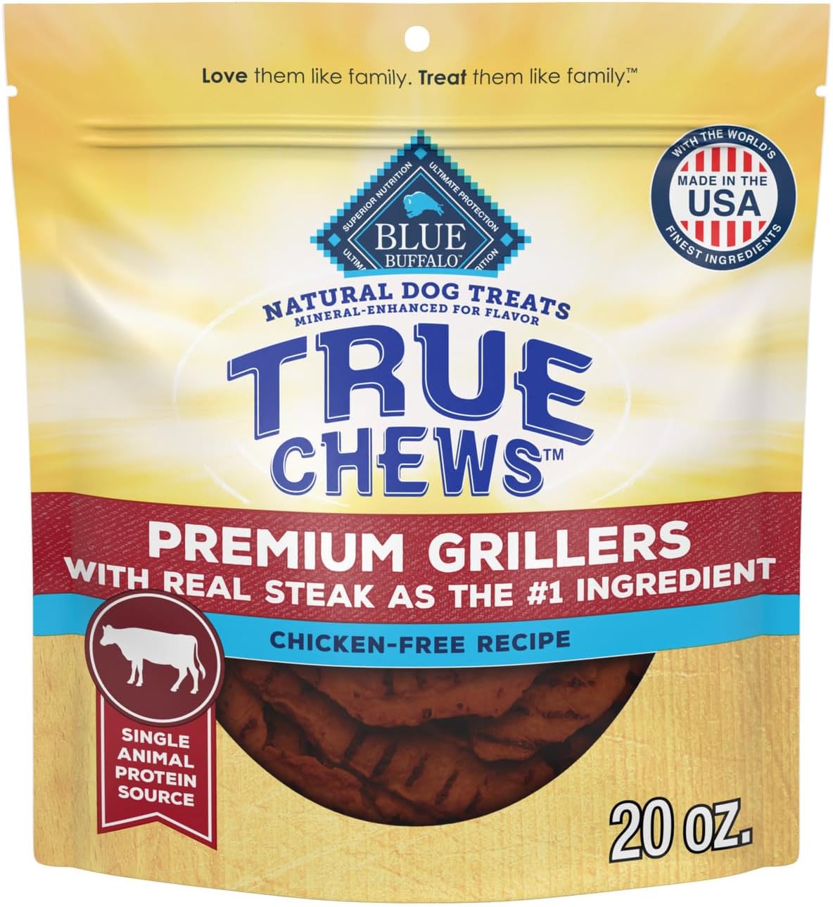 {"about_product": ["REAL BEEF FIRST: These Blue Buffalo dog treats are made with real beef for a taste dogs just can't resist", "TENDER & TASTY: These delicious real-beef dog treats are the perfect reward for all breed sizes", "MADE IN THE USA: Blue Buffalo natural dog treats are made in the USA with the world's finest natural ingredients", "WHOLESOME INGREDIENTS: These healthy dog snacks contain no artificial preservatives, corn, wheat, or soy", "Contains: One (1) 20-oz bag of BLUE True Chews Natural Premium Grillers Dog Treats, Steak Recipe", "ENHANCED IMAGERY: We have enhanced our digital product packaging to highlight our products’ ingredients and essential benefits; while the physical packaging will differ slightly, all information is accurate"], "product_description": "Give your dog the taste of real steak with BLUE True Chews Premium Grillers Natural Dog Treats. Made with real USA beef as the first ingredient, these tender dog treats are easy to tear into smaller pieces, so they're great for dogs of all breed sizes and ages. And like all Blue Buffalo dog treats, these treats for dogs never contain chicken (or poultry) by-product meals, corn, wheat, soy, artificial flavors, or preservatives. Watch their tail wag when you reward them with BLUE True Chews Premium Grillers Chicken Dog Treats.", "product_information": {"ASIN": "B0BJFQTKNK", "Size": "1.25 Ounce (Pack of 1)", "Color": "Brown", "Material": "Plastic", "Brand Name": "Blue Buffalo", "Department": "Unisex-Adult", "Directions": "Small (5-10 lbs.) ½ per day Small/Medium (11-25 lbs.) 1 per day Medium (26-50 lbs.) 2 per day Large (Over 50 lbs.) 3 per day", "Model Name": "Blue Buffalo True Chews Premium Grillers Natural Dog Treats", "Item Weight": "20 Ounces", "Manufacturer": "Blue Buffalo Company, Ltd", "Number of Items": "1", "Item model number": "804519", "Included Components": "Blue Buffalo True Chews Premium Grillers Natural Dog Treats, Steak 20 oz Bag", "Breed Recommendation": "All Breed Sizes", "Date First Available": "October 17, 2022", "Warranty Description": "Warranty", "Age Range Description": "All Life Stages", "Item Dimensions LxWxH": "3.5 x 10 x 12 inches", "Target Audience Keyword": "dogs", "Specific Uses for Product": "Behavior", "Item Package Dimensions L x W x H": "9.49 x 8.66 x 3.07 inches"}, "product_details": {"Brand": "Blue Buffalo", "Flavor": "Steak", "Item Form": "Dry", "Age Range (Description)": "All Life Stages", "Specific Uses For Product": "Behavior"}}
