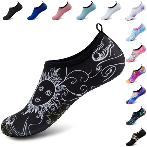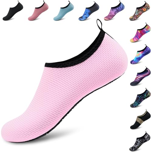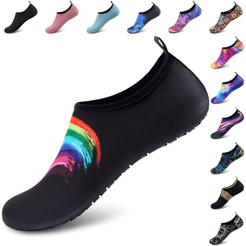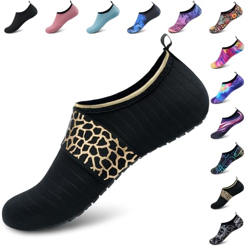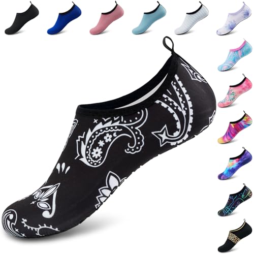 {"about_product": ["【COMFORTABLE】: Barefoot water shoes are ultra-lightweight style and more breathable. Upper with stretch fabric for fast draining, give excellent flexible and comfortable.", "【CONVENIENCE】: Quick-dry water sports shoes, smooth neck design of aqua socks prevents chafing when wearing aqua shoes. Sock-like, flexible and comfortable. Easy to wear and take off. Lightweight and compressible for easy packing.", "【FOOT SAFETY】: Special blocks sole texture design with good anti-slip ability can help you keep your balance in slippery places, water shoe can also protect your feet from gravel on hot beaches, land or water.", "【OCCASIONS】: Men's and women's water shoes perfect for water park, beach, pool, swimming, surfing, sailing, boating, fishing, kayaking, windsurfing, yoga training, jogging, walking, car-washing, gardening, lawn, cycling, and driving. Especially for family outings!", "【VARIOUS SIZE AVAILABLE】: Size of swim shoes for women and men. ( Please refer to product description for length). There are a variety of colorful styles to choose, such as multiple prints and solid, the style design to keep up with the latest fashion."], "product_description": "Deevike Water Shoes for Women Men Barefoot Quick-Dry Aqua Socks Slip-on for Beach Swim Surf Yoga Exercise\nFeatures: \n -Closure: Slide on \n -Sole material: Ultra-Light Non-Slip Rubber\n -Upgraded water shoes are light, and it makes you feel like barefoot\n -Quick-dry water shoes, breathable and smooth fabrics with fine stretch on uppers\n Why Choose Our Quick Dry Barefoot water shoes/water sock?\n 1.Comfortable Feeling : \n Our water shoes very comfortable and perfect for beach/swimming pool use!They were sleek, stylish and felt like socks on our feet!.\n 2.High Quality Fabric: \n 92% polyester and 8% spandex upper, soft and quick-dry, let your feet feel breathable and comfortable. The pattern design is very fashionable and interesting.\n 3.Occasion: \n Our multifunctional sports shoes can use for beach play,swimming,surfing,yoga,boating, kayaking indoor ect.\n 4.Non-slip Sturdy Sole: \n Despite their soft and thin exterior, they held up perfectly for climbing rocks on waterfalls and cliff jumping! They had a a grippy bottom which prevented us from slipping on the slippery rocks.\nSize Information:\n US Women:5.5-6.5/Men:4.5-5.5 = Insole Length 8.46in = EU 36-37 \n US Women:7.5-8.5/Men:6-7 = Insole Length 9.0in = EU 38-39 \n US Women:9-10/Men:7.5-8.5 = Insole Length 9.45in = EU 40-41 \n US Women:11-12/Men:9.5-10 = Insole Length 10.03in = EU 42-43 \n US Women:12.5-13/Men:10.5-11 = Insole Length 10.55in = EU 44-45\n NOTE:This shoes are not suitable on dangerous rocks. \n Please rinse with clean water, place in ventilated place to dry.\n Do not place it by the fire to dry it.", "product_information": {"ASIN": "B0D7TPV7B4", "Department": "womens", "Customer Reviews": "4.3 4.3 out of 5 stars \n\n (3,031)", "Product Warranty": "For warranty information about this product, please click here", "Best Sellers Rank": "#54,334 in Clothing, Shoes & Jewelry (See Top 100 in Clothing, Shoes & Jewelry) #55 in Women's Water Shoes", "Date First Available": "June 23, 2024"}, "product_details": {"Closure type": "Pull-On", "Sole material": "Rubber", "Inner material": "92% polyester+8% spandex", "Outer material": "92% polyester+8% spandex Upper"}}