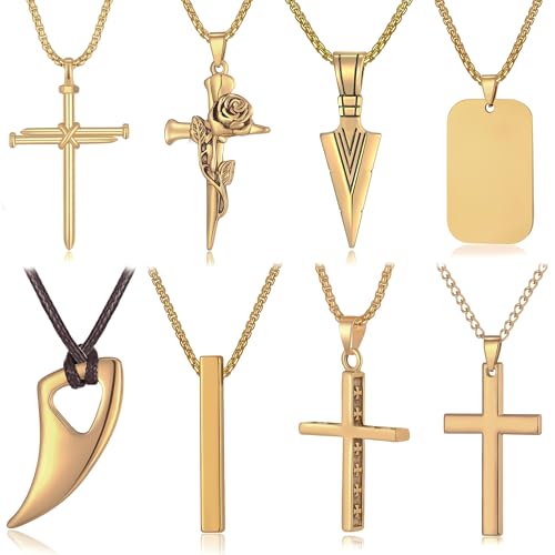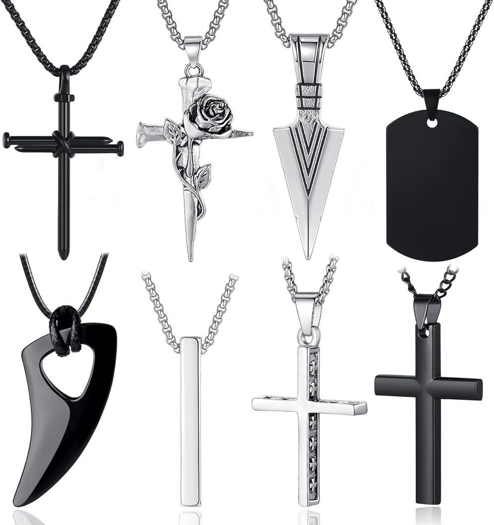 {"about_product": ["[Necklace for Men]: Our mens necklaces are crafted by hand using high quality stainless steel that is completely nickel-free. This reduces the likelihood of skin irritation and makes them anti-rust and anti-corrosion. Plus, this men jewelry necklace is comfortable to wear.", "[Size]: Durable stainless steel link chain/black leather braided rope: 16-24 inches/41-60 cm. The chains of necklace for men are interchangeable, so you don't have to worry about getting the wrong size.", "[Men's Necklaces Set]: Our mens necklaces jewelry necklace set includes 8 pcs pendant necklaces, including 2 black cross necklaces, 2 silver cross necklaces, an arrowhead necklace, a wolf tooth necklace, a bar necklace, and a tag necklace.", "[Great Jewelry Gift]: These 8 pcs pendant necklaces for men and are carefully selected for their simple and popular style and color. They're perfect for daily wear or as a gift for your loved ones, fathers dad gifts for dad, family, friends, and the theme of cross pendant necklace set especially good for those with religious beliefs.", "[After-Sale Service]: Our men necklaces set are made of high-quality stainless steel and are plated to prevent fading. If you find any defects when you receive products, please contact us. MAIBAOTA will solve the issue for you within 24 hours!"], "product_description": null, "product_information": {"ASIN": "B0CM99D6M7", "Department": "mens", "Manufacturer": "MAIBAOTA", "Customer Reviews": "4.3 4.3 out of 5 stars \n\n (925)", "Best Sellers Rank": "#21,477 in Clothing, Shoes & Jewelry (See Top 100 in Clothing, Shoes & Jewelry) #129 in Men's Necklaces", "Package Dimensions": "4.72 x 4.33 x 0.67 inches; 6 ounces", "Date First Available": "July 25, 2023"}, "product_details": {"Gem type": "No Gemstone", "Material": "Stainless Steel", "Chain type": "C-Link", "Clasp type": "Buckle", "Metal type": "Stainless Steel", "Item type name": "Necklaces"}}