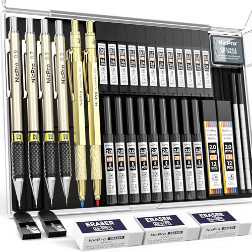 {"about_product": ["35PCS Upgraded Version Artist Set:Come with 6 PCS drafting pencils and 20 tubes of lead refill in 0.5 mm & 0.7mm & 0.9mm & 2.0 mm, 3 pcs 4B erasers, 1 pcs kneaded eraser, 18 pcs cap eraser refills, 2 pcs lead sharpener, a storage case.", "4 Line Size & 6 Hardness: This awesome pencil set come with several size of lead refills for various line widths:0.5/0.7/0.9/2.0,the 2mm graphite pencil come with 6 hardness lead 2B HB 2H 4H 4B 6B to create different darkness, perfect for your daily use,they don't break easily, and write smoothly,there are also 2 tube of color lead for highlight or coloring", "Ergonomic, Comfortable Design :The full-metal body provides ideal weight balance for fatigue-free writing and drawing or sketching, It brings you more effective and high quality tasks. The lead advances easily at the touch of a click. There is a sharpener in the cap of 2.0 mm mechanical pencil.", "Two Type Anti-Slip Grips: Rhombus textured rubber grips and metal threaded anti-skidding, these pencils adopt different grip design base on pencil weight and applicable scene, only for better experience", "Perfect School Supplies :Ideals for teachers and students, artists, professionals,engineer alike. Perfect for writing, drafting, drawing, sketching or architectural working. Back to the basics! it will be also a great gift for your kids,parents,other family members and friends"], "product_description": null, "product_information": {"ASIN": "B0C3R6S4SL", "Brand": "Nicpro", "Color": "Black", "Closure": "Retractable", "Grip Type": "Knurled", "Ink Color": "Black", "Line Size": "0_5mm, 0_7mm, 0_9mm, 2_0mm", "Point Type": "Fine", "Item Weight": "13.7 ounces", "Manufacturer": "NICPRO CO.,LTD", "Material Type": "Metal", "Number of Items": "9", "Best Sellers Rank": "#150 in Office Products (See Top 100 in Office Products) #5 in Mechanical Pencils", "Item model number": "MP1000", "Product Dimensions": "8 x 0.7 x 6 inches", "Date First Available": "April 27, 2023", "Manufacturer Part Number": "MG599", "Pencil Lead Degree (Hardness)": "HB"}, "product_details": {"Brand": "Nicpro", "Color": "Black", "Ink Color": "Black", "Age Range (Description)": "Adult", "Writing Instrument Form": "Mechanical Graphite Pencil"}}