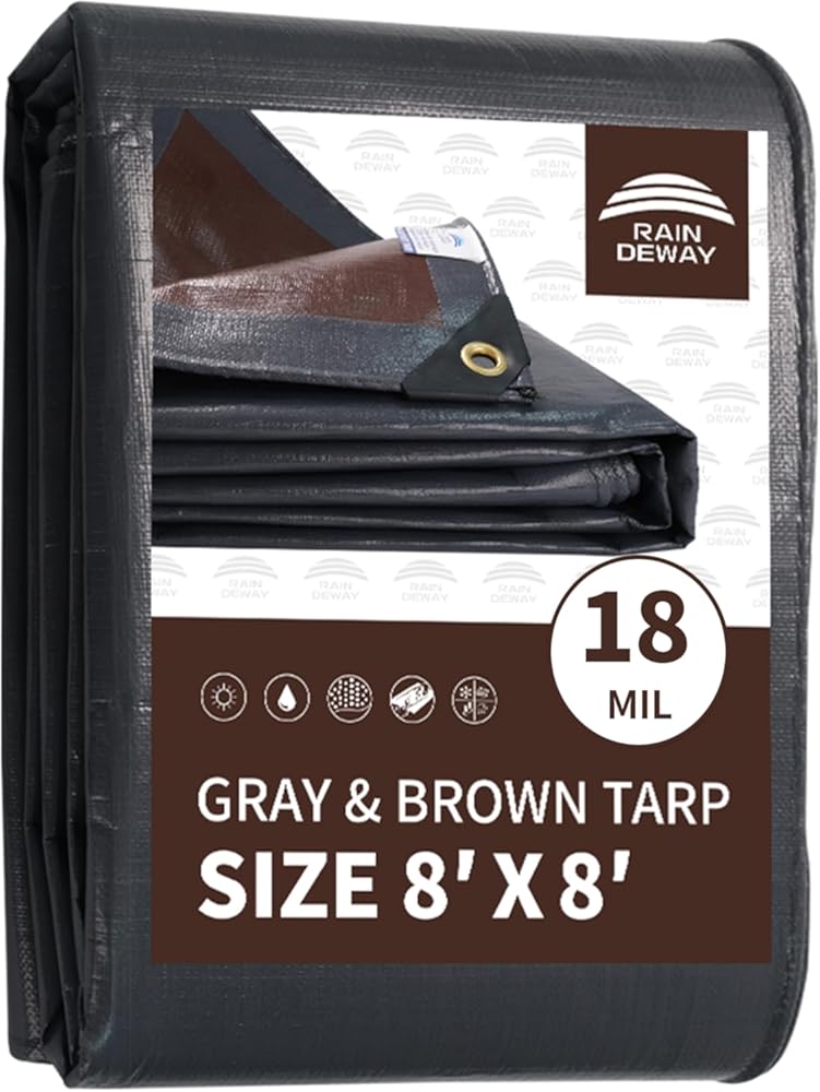 {"about_product": ["【18 Mil SUPER HEAVY DUTY TARP】 9.2 oz / sq yard on average, can use either side if you want gray or brown. This tarp is made of tightly-woven polyethylene fibers, and has a 16 x 16 weave count, ,Strong Waterproof Tarp, Ultra Heavy Duty, Durable, Secure", "【METAL GROMMETS + REINFORCED EDGES】 The Edges has reinforced Metal Grommets holes to fix on various objects and locations, The spacing of the grommets is about 18 inch, This design will gives you a long-lasting cover", "【UV RESISTANT TARP +WEATHER PROOF】This tarp can provide a UV protection in the sun, It protect your objects from extreme weather conditions,Mother Nature can be unpredictable, but you can be prepared, so be sure to protect your outdoor equipment and supplies with this weatherproof Heavy Duty Tarp", "【FINISHED SIZE + MULTIPURPOSE USE】The size of RAINDEWAY tarp is actual size that can be used, If you choose RAINDEWAY tarp you will get a full size tarp, and protect your roof, truck, car, tent, pet cages, boat, or backyard pool, outdoor furniture from rain, sand, dirt, and sunlight, weather resistant. You never know when a tarp will come in handy", "【2024 NEW UPGRADE】RAINDEWAY professionally sell tarpaulins and understand the needs of consumers better. We committed to product upgrades and innovations , Here are the latest design and production of products in 2024"], "product_description": null, "product_information": {"ASIN": "B0C6XF5JYW", "Size": "8x8 Feet-Finished size", "Brand": "RAINDEWAY", "Color": "Gray/Brown", "Material": "Polyethylene (PE)", "Item Weight": "4.22 pounds", "Manufacturer": "RAINDEWAY", "Item Thickness": "0.02 Inches", "Number of Items": "1", "Best Sellers Rank": "#7,244 in Tools & Home Improvement (See Top 100 in Tools & Home Improvement) #29 in Tarps", "Product Dimensions": "96\"L x 96\"W", "Batteries Included?": "No", "Batteries Required?": "No", "Included Components": "Carry bag", "Date First Available": "June 2, 2023", "Water Resistance Level": "Waterproof", "Center To Center Spacing": "64 Inches", "Recommended Uses For Product": "Beach, Boating, Camping, Emergency Preparedness, Festival, Hiking, Sporting Events", "Ultraviolet Light Protection": "True"}, "product_details": {"Size": "8x8 Feet-Finished size", "Brand": "RAINDEWAY", "Color": "Gray/Brown", "Material": "Polyethylene (PE)", "Item Thickness": "0.02 Inches", "Number of Items": "1", "Product Dimensions": "96"L x 96"W", "Included Components": "Carry bag", "Water Resistance Level": "Waterproof", "Recommended Uses For Product": "Beach, Boating, Camping, Emergency Preparedness, Festival, Hiking, Sporting Events"}}