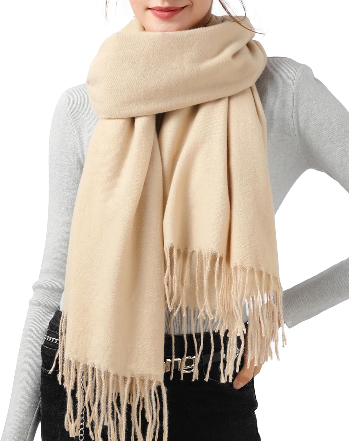 {"about_product": ["【MATERIAL】Women scarf is made of high quality material, soft and cozy, and good hand feel like cashmere scarf. This pashmina scarf is perfect for a chilly outdoor night in winter.", "【SIZE】Approximate length 80\" (78\" + 3\" fringes each side); width approx 27\", weight approx 7.8 OZ / 220 G. The oversize scarf can be wore as a scarf, shawl or wrap for women.", "【VERSATILITY】A beautiful complement of pashmina feel shawls to a formal outfit for any holiday season party such as wedding ceremony, anniversary and birthday, and great as a warm scarf during cold winter.", "【A SWEET PRESENT】 The pashmina shawl wrap is a warm present to your family, friends, These cashmere feel scarfs are excellent presents for festivals like Mother's Day, Thanksgiving, or Big Days like anniversaries, birthdays, or weddings.", "【VARIETY】Our scarves wraps are available in multiple colors, from the classic black shawl and white shawl to other vibrant colorful tones. Various fashion colors meet different requirement."], "product_description": "", "product_information": {"ASIN": "B0CHYLNVMT", "Department": "womens", "Customer Reviews": "4.6 4.6 out of 5 stars \n\n (427)", "Product Warranty": "For warranty information about this product, please click here", "Best Sellers Rank": "#24,903 in Clothing, Shoes & Jewelry (See Top 100 in Clothing, Shoes & Jewelry) #114 in Women's Cold Weather Scarves & Wraps", "Date First Available": "September 13, 2023"}, "product_details": {"Origin": "Imported", "Fabric type": "30% cotton and 70% polyester", "Care instructions": "Hand Wash Only"}}