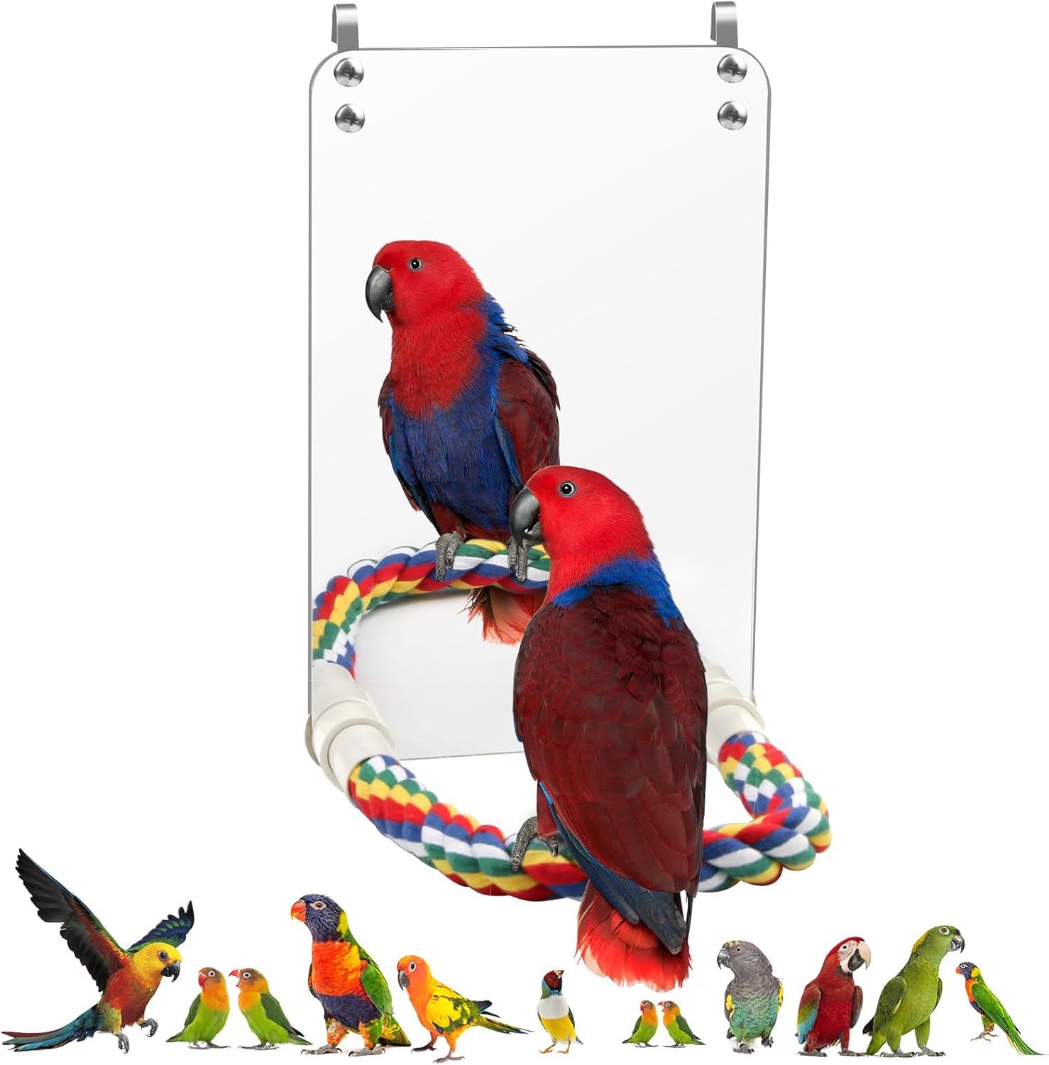 {"about_product": ["High-Quality Material: Our bird mirrors are made of acrylic mirrors, cotton rope, and Galvanized iron accessories, non-toxic, resistant to abrasion, improved safety, and durability, and satisfy the curiosity of birds.", "Size: The bird mirror size is 9.4 x 5.9 inches, suitable for most bird cages and birds, such as parakeet cages, cockatiel conures, lovebirds, parrots, canaries, and budgies.", "Colorful Rope Perch: The colorful rope perch is durable and robust, very suitable for birds to stand and play, exercise balance and coordination, and at the same time, see themselves in the mirror.", "BEST GIFT: You can give this bird mirror to friends or family who love to keep birds; the bird mirror comes with two integrated metal hooks and a colorful rope holder that allows you to hang the mirror anywhere in the cage.", "Notice: Please tear off the protective film on the bird mirror surface before installation."], "product_description": null, "product_information": {"ASIN": "B0CCR6CHM6", "Size": "9.4''", "Style": "Safety", "Brand Name": "Coolrunner", "Department": "unisex-adult", "Model Name": "Mirror", "Item Weight": "8.1 ounces", "Manufacturer": "Coolrunner", "Item model number": "L", "Included Components": "NO", "Breed Recommendation": "Large", "Date First Available": "July 8, 2021", "Warranty Description": "NO", "Age Range Description": "All Life Stages", "Item Dimensions LxWxH": "9.4 x 5.9 x 9.4 inches", "Target Audience Keyword": "birds", "Specific Uses for Product": "Indoor", "Item Package Dimensions L x W x H": "10.12 x 7.4 x 1.38 inches"}, "product_details": {"Brand": "Coolrunner", "Color": "Silver", "Material": "Acrylic", "Product Dimensions": "9.4"L x 5.9"W x 9.4"H", "Product Care Instructions": "Hand Wash Only"}}