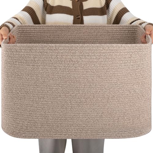 {"about_product": ["Large size Blanket Basket:22”x17”x12”, which perfect for throw pillows, ,cushions,blankets, comforter,toys and clothes.Keep in the kids room, family room, or any room in the house that could use extra storage: fits on a closet shelf, beside the sofa or bed", "Natural Cotton rope basket:OIAHOMY high quality dirty clothes basket is made of cotton Rope, No Chemical No Nasty No Disgusting Smell,Safe for Intimate Clothing.In addition,this blanket storage is no sharp edges and a hard surface, safe for kids, elders,pets", "Double reinforced Handles:We use the highest grade cotton rope as raw material and all the stitches are distribution and fine,which makes the toy baskets better wear resistance and durability to be used for many years.In addition, the handle of this large basket has a unique design and is wrapped around with thick double-layer suture rope to prevent tearing and keep its shape and never fall off", "Collapsible Baskets:This rectangular storage basket are foldable for easy to move and take away, simply fold the basket down flat for space-saving storage when not in use or to transport", "NOTE: The toy basket is folded, but it will turn back to its elegant shape quickly if you fill it with some pillows or blankets, and iron is great idea to remove the creases"], "product_description": null, "product_information": {"UPC": "717765826881", "ASIN": "B0CF586TH4", "Brand": "OIAHOMY", "Color": "Brown variegated", "Shape": "Rectangular", "Style": "Modern", "Capacity": "70 Liters", "Material": "Cotton", "With Lid": "No", "Finish Type": "White", "Item Weight": "3.5 pounds", "Closure Type": "Open Top", "Finish types": "White", "Manufacturer": "OIAHOMY", "Handle Material": "Cotton", "Special Feature": "Durability, Foldable, Handle, Portable, Washable", "Number of Pieces": "1", "Best Sellers Rank": "#571 in Baby (See Top 100 in Baby) #3 in Nursery Bins & Boxes", "Item model number": "FSB-A-C-02", "Batteries required": "No", "Product Dimensions": "17\"D x 22\"W x 12\"H", "Included Components": "Handle", "Recommended Uses For Product": "Laundry, Storage"}, "product_details": {"Brand": "OIAHOMY", "Color": "Brown variegated", "Shape": "Rectangular", "Material": "Cotton", "Product Dimensions": "17"D x 22"W x 12"H"}}