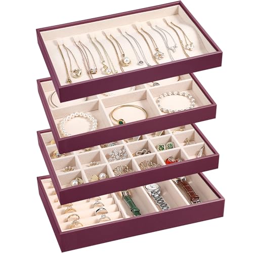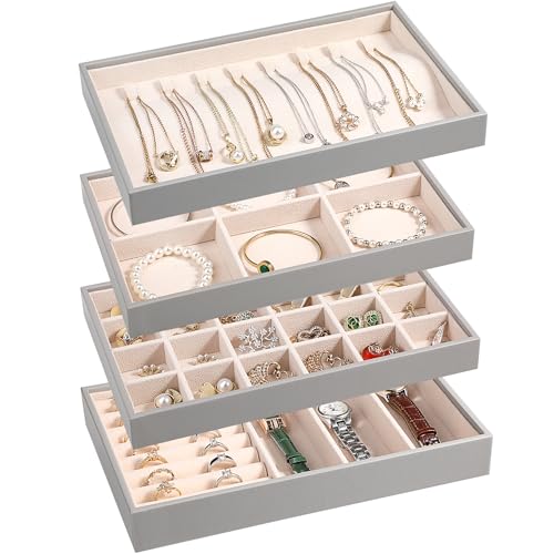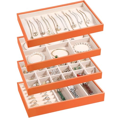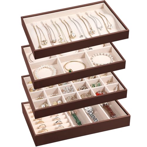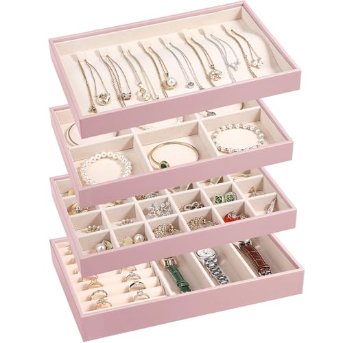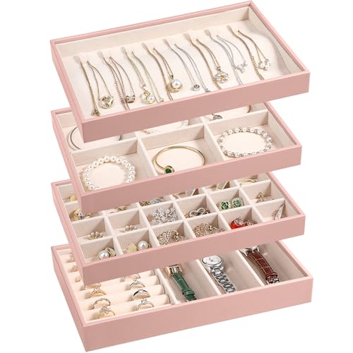 {"about_product": ["Set of 4: The jewelry organizer trays set includes rings & watch display tray (1 pc), 6-compartment bracelets tray removable(1 pc), 24-compartment earrings tray (1 pc), 8 hook necklace tray(1 pc) for earrings, rings, bracelets,necklaces,watch. You can visually see all of your precious belongs, makes selection easier, while save space.", "High Quality Material: Made of high-quality beaded flannel, leather and composite boards with removable compartment dividers,This jewelry tray display box is softly lined to protect your jewelry from damage, has a simple and elegant look, and is durable, making it your first choice for home jewelry storage.", "Individual Storage: Each jewelry tray organizer measures 10.23\" x 6.49\" x 4.92\" (L x W x H) and is ideal for storing and displaying your jewelry in your home or store. you can adjust the size and number of compartments by removing or adding dividers to meet your individual storage needs.", "The set of 4 jewelry organizer can be easily split up, combined or stacked, doesn’t slide, easy placement in dressers or drawers. In addition, it is great to display earrings, necklaces, bracelets, rings, brooches, pins, watches in the jewelry store,showcase.", "Delicate Ideal Gift: Beautiful gift for jewelry lovers in your life,gifts for women girls or mens. It's suitable for birthday,wedding,party,Anniversary Day,Christmas gifts,Valentine's Day,Mother's Day,father's day,New Year,It's also a nice room decor at home."], "product_description": null, "product_information": {"ASIN": "B0CG922DLR", "Brand": "LANDICI", "Color": "Apricot", "Shape": "Rectangular", "Style": "French, Vintage", "Usage": "Jewelry Organizer", "Finish": "Polished", "Material": "Leather, Beaded Flannel", "Finish Type": "Polished", "Item Weight": "2.4 pounds", "Manufacturer": "LANDICI", "Mounting Type": "Table Top", "Inner Material": "Beaded Flannel", "Number of Items": "1", "Special Feature": "Adjustable, Jewelry Organizer, Removable, Stackable, Sturdy", "Target Audience": "Girls, Women", "Special Features": "Adjustable, Jewelry Organizer, Removable, Stackable, Sturdy", "Best Sellers Rank": "#76,417 in Clothing, Shoes & Jewelry (See Top 100 in Clothing, Shoes & Jewelry) #172 in Jewelry Trays", "Item model number": "US-FRZ-Jewelry Tray012-AP", "Number of Drawers": "4", "Product Dimensions": "6.49\"D x 10.23\"W x 4.72\"H", "Batteries Included?": "No", "Batteries Required?": "No", "Date First Available": "October 7, 2023", "Jewelry Storage Type": "Jewelry Tray", "Item Package Quantity": "1", "Number of Compartments": "4", "Recommended Uses For Product": "Bracelet, Earring, Necklace, Watch"}, "product_details": {"Brand": "LANDICI", "Color": "Apricot", "Shape": "Rectangular", "Style": "French, Vintage", "Material": "Leather, Beaded Flannel", "Finish Type": "Polished", "Special Feature": "Adjustable, Jewelry Organizer, Removable, Stackable, Sturdy", "Target Audience": "Girls, Women", "Product Dimensions": "6.49"D x 10.23"W x 4.72"H", "Recommended Uses For Product": "Bracelet, Earring, Necklace, Watch"}}