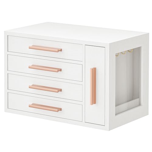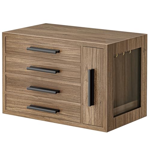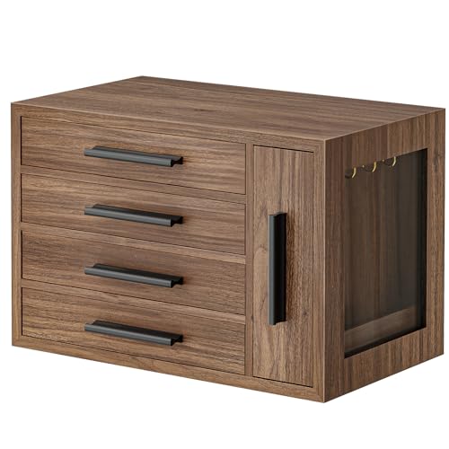 {"about_product": ["Large Capacity: This wooden jewelry box has 4 drawers with different partitions to meet your various storage needs for jewelry such as rings, earrings, brooches, and lipsticks. The side vertical drawer is for hanging necklaces, keeping your jewelry tidy", "Sleek Appearance: The combination of a cube shape and metal handles makes this jewelry organizer not only fashionable but also modern. It can be used as a jewelry storage box on a vanity table or as decoration in a wardrobe", "Versatile Use: Whether on a bedroom vanity table or in a wardrobe, this vintage jewelry box offers a organizational solution for your brooches, necklaces, rings, bracelets, and other accessories, showcasing a stylish and orderly appearance", "Built to Last: This large jewelry box is made of quality MDF frame with wood grain finish and soft velvet lining, keeping your jewelry from scratches or damage. Every detail is carefully designed for better protection of your jewelry", "Practical Storage: This jewelry organizer combines elegance with practicality, offering ample space for various jewelry pieces. It can be presented on special occasions and is well-matched for mothers, wives, or friends needing a functional storage solution for their collections"], "product_description": null, "product_information": {"ASIN": "B0CK14YXT5", "Brand": "HOOBRO", "Color": "Walnut + Black", "Shape": "Rectangular", "Style": "Vintage", "Finish": "Textured", "Material": "MDF, Metal, Acrylic Sheet, Velvet", "Finish Type": "Textured", "Item Weight": "5.94 pounds", "Part Number": "BH09JB04", "Manufacturer": "HOOBRO", "Mounting Type": "Freestanding", "Inner Material": "Velvet", "Number of Items": "1", "Special Feature": "Wooden Jewelry Box", "Target Audience": "Girls, Women", "Special Features": "Wooden Jewelry Box", "Best Sellers Rank": "#58,047 in Clothing, Shoes & Jewelry (See Top 100 in Clothing, Shoes & Jewelry) #298 in Jewelry Boxes", "Item model number": "BH09JB04 Jewelry Box", "Number of Drawers": "5", "Product Dimensions": "6.3\"D x 10.6\"W x 7.1\"H", "Batteries Included?": "No", "Batteries Required?": "No", "Date First Available": "January 9, 2024", "Jewelry Storage Type": "Jewelry Box", "Item Package Quantity": "1", "Number of Compartments": "5", "Recommended Uses For Product": "Bangle, Bracelet, Earring, Necklace, Ring"}, "product_details": {"Brand": "HOOBRO", "Color": "Walnut + Black", "Shape": "Rectangular", "Style": "Vintage", "Material": "MDF, Metal, Acrylic Sheet, Velvet", "Finish Type": "Textured", "Special Feature": "Wooden Jewelry Box", "Target Audience": "Girls, Women", "Product Dimensions": "6.3"D x 10.6"W x 7.1"H", "Recommended Uses For Product": "Bangle, Bracelet, Earring, Necklace, Ring"}}