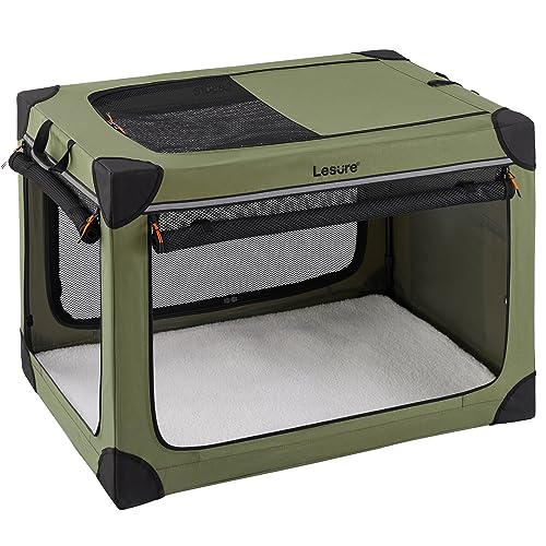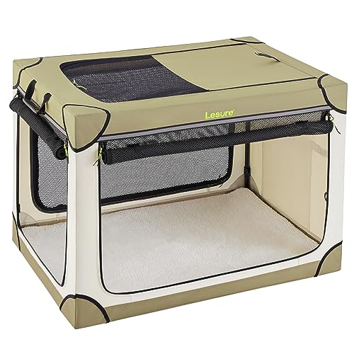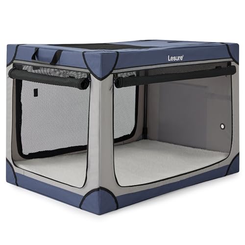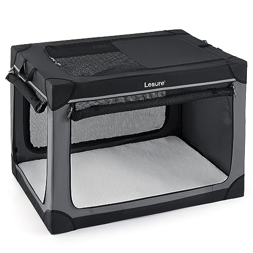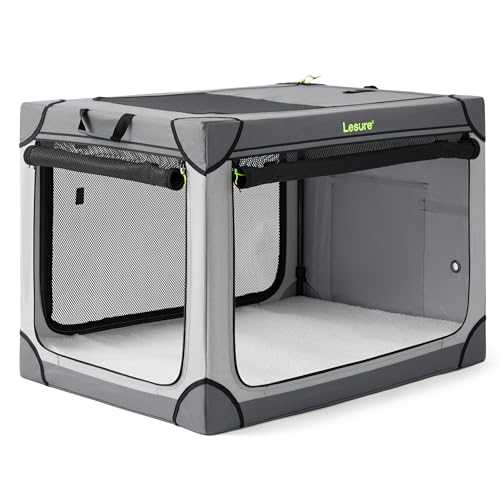 {"about_product": ["Designed for Traveling: As the recipient of a 2026 Good Housekeeping Award, this soft-sided crate features a foldable construction frame that can be easily folded into an extra compact package. It comes with a convenient storage bag, allowing you to carry it effortlessly on your outings and travels. The quick assembly in just 2 minutes and easy disassembly make it a hassle-free choice for your adventures.", "Breathable & Comfortable: The four-side zippered breathable mesh walls ensure optimal ventilation, providing a comfortable environment for your furry friend. The soft plush mat inside the crate offers a cozy and comfortable space for them to relax and unwind.", "Enhanced Safety: This crate features a sturdy iron frame that maintains structural integrity. Reflective strips on both sides provide visibility for your pet's safety. The self-locking zipper system prevents escapes, while the mesh offers secure containment. An integrated leash adds an additional safety measure.", "Easy Assembly, Storage, & Maintenance: The convenient and simple design allows for quick assembly within 2 minutes. The crate can be folded into two different ways, catering to various indoor and outdoor settings. It features a water resistant design with waterproof fabric, making it easy to clean with just a damp cloth. The removable and machine washable mat simplifies care.", "Various Sizes for All Breeds: This crate is available in four sizes to accommodate different breeds and sizes of pets. Choose from S (up to 35lbs), M (up to 50lbs), L (up to 70lbs), and XL (up to 90lbs) to find the perfect fit for your furry companion."], "product_description": null, "product_information": {"ASIN": "B0CL71NSZZ", "Size": "XL - 42\"", "Color": "Grey", "Style": "Casual", "Material": "Polyester", "Brand Name": "LE SURE", "Item Weight": "9 Pounds", "Manufacturer": "Bedsure Comfy Pet", "Care Instructions": "Waterproof-Easy Clean", "Included Components": "Crate", "Breed Recommendation": "All Breed Sizes", "Date First Available": "January 1, 2024", "Item Dimensions LxWxH": "42 x 31 x 31 inches", "Target Audience Keyword": "Dogs, dogs", "Specific Uses for Product": "Indoor, Outdoor", "Item Package Dimensions L x W x H": "32.5 x 11 x 8 inches"}, "product_details": {"Brand": "LE SURE", "Color": "Grey", "Material": "Polyester", "Special Feature": "Collapsible, Foldable, Portable", "Product Dimensions": "42"L x 31"W x 31"H"}}
