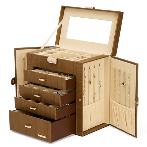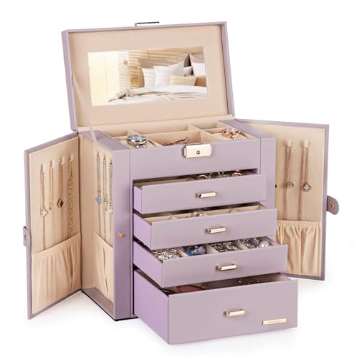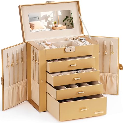 {"about_product": ["Jewelry and Watch Box: With 2 removable pillows in the top layer, you can store not only your jewelry but also your watches.", "ELEGANT: Attractive appearance with white faux leather surface and soft velvet lining. Over Dimension: 10.43’’ (L) X 6.10’’ (W) X 11.14’’ (H), large enough to hold your watches, necklaces, earrings, bracelets, hairpins, brooches and other jewelry.", "4 Pull Out Drawers, includes a deeper bottom drawer and 3 equal size drawers. Drawer 1 has 4 earring cards and a ring roll. Drawer 2 has 12 equal size compartments. Drawer 3 has 4 equal size compartments. The deeper bottom drawer has only one compartment to store large jewelries. Each drawer is equipped with a delicate handle which can be opened easily.", "Swing Out Cabinets, each with 8 necklace hooks and 2 storage ledges, help to keep your necklaces from getting tangled.", "Perfect gift: The lid has a ribbon attached to keep it from falling back, mirror makes it easier to dress yourself, lock with a key adds elegance and security. Ideal gift for Valentine's Day, Mother’s Day, Thanksgiving Day, Christmas, birthday and wedding. Watch and Jewelry are not included."], "product_description": null, "product_information": {"UPC": "810088832086", "ASIN": "B0CLCH13T7", "Brand": "Homde", "Color": "White + Gold", "Shape": "Rectangular", "Style": "Modern", "Material": "Faux Leather", "Finish Type": "Mirrored", "Item Weight": "6.84 pounds", "Manufacturer": "Homde", "Warranty Type": "No Warranty", "Inner Material": "Leather", "Special Feature": "Lock", "Target Audience": "Women", "Best Sellers Rank": "#1,511 in Clothing, Shoes & Jewelry (See Top 100 in Clothing, Shoes & Jewelry) #4 in Jewelry Boxes", "Item model number": "HJ001", "Number of Drawers": "4", "Product Dimensions": "6.1\"D x 10.43\"W x 11.14\"H", "Date First Available": "October 27, 2023", "Jewelry Storage Type": "Jewelry Box", "Number of Compartments": "4", "Recommended Uses For Product": "Bangle, Bracelet, Earring, Necklace, Ring, Watch"}, "product_details": {"Brand": "Homde", "Color": "White + Gold", "Shape": "Rectangular", "Style": "Modern", "Material": "Faux Leather", "Finish Type": "Mirrored", "Special Feature": "Lock", "Target Audience": "Women", "Product Dimensions": "6.1"D x 10.43"W x 11.14"H", "Recommended Uses For Product": "Bangle, Bracelet, Earring, Necklace, Ring, Watch"}}