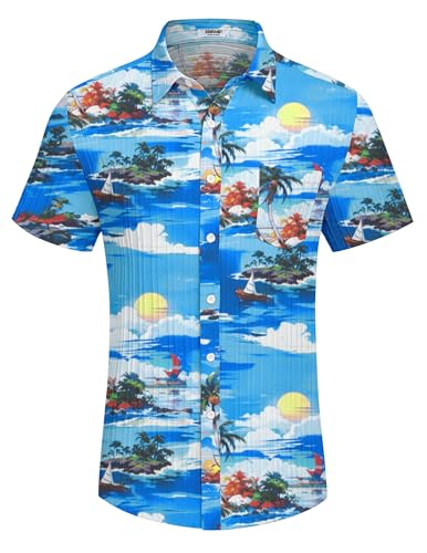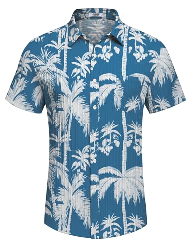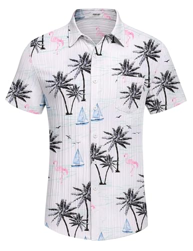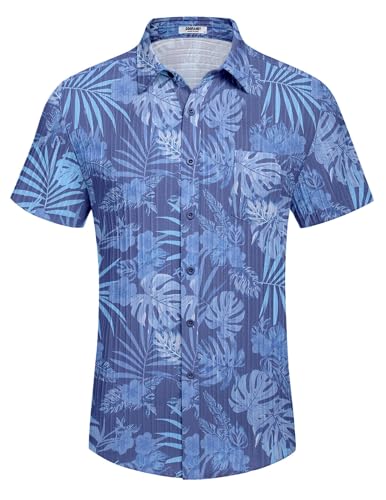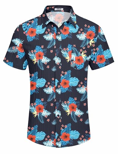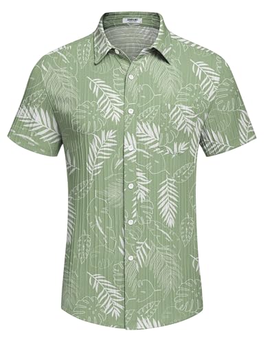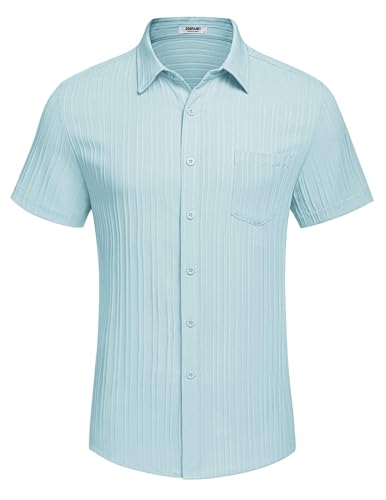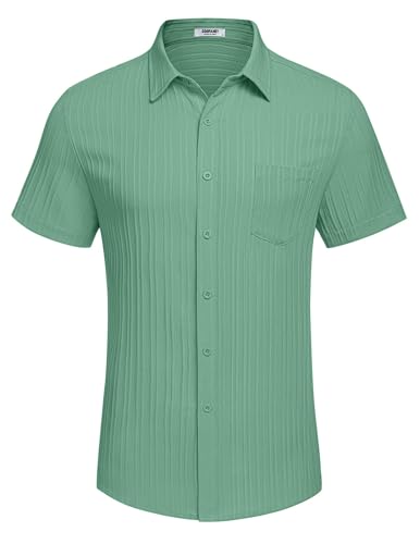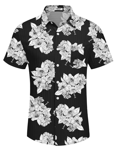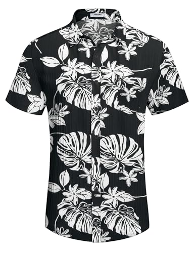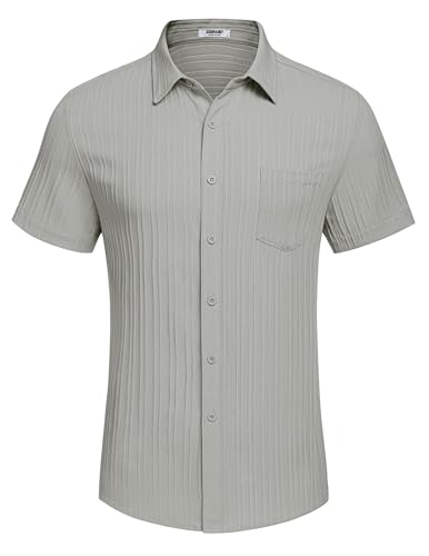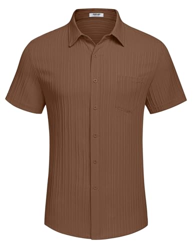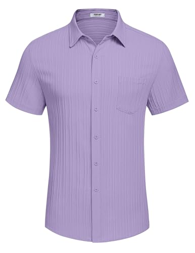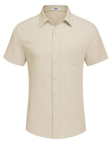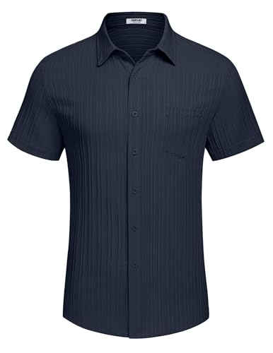 {"about_product": ["Textured Fabric --- Men's short sleeve button down shirt is made of premium textured fabric, which is breathable, soft and skin-friendly, keeping you cool and comfortable in the summer", "Unique Design --- Mens beach shirts features short sleeve, spread collar, button closure, chest pocket, relaxed fit. The unique slight vertical rib texture makes this shirt more stylish and simple", "Collocation --- This men button up shirt makes a perfect versatile item and can easily be worn with to match with shorts, jeans, trousers. Adding to your current collection that creat sophisticated look", "Occasions --- Short sleeve summer shirt suitable for casual daily wear, beach, tropical aloha theme, camp, school, office, beach, wedding, yoga, work or other leisure activities", "Garment Care --- Machine Wash casual button-down shirt, relaxed fit casual style,Please refer to the SIZE CHART for selection"], "product_description": null, "product_information": {"ASIN": "B0DDXWG187", "Department": "mens", "Customer Reviews": "4.4 4.4 out of 5 stars \n\n (2,078)", "Best Sellers Rank": "#1,625 in Clothing, Shoes & Jewelry (See Top 100 in Clothing, Shoes & Jewelry) #25 in Men's Button-Down Shirts", "Package Dimensions": "3.94 x 3.94 x 0.39 inches; 3.53 ounces", "Date First Available": "October 23, 2023"}, "product_details": {"Cuff style": "Short Sleeve", "Neck style": "Collared Neck", "Fabric type": "65%polyester30%rayon5%spandex", "Sleeve type": "Short Sleeve"}}