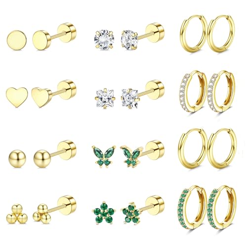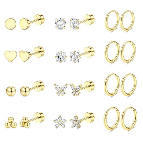 {"about_product": ["Hypoallergenic Surgical Steel Earrings: Premium genuine 316L stainless steel for sensitive ears. No allergy, no irritation, nickel & lead free, no rust & tarnish. Newly upgraded vacuum plated with 14K gold plated, safer than normal electroplating. Smooth surface, comfortable to wear.", "Comfortable Flat Back Earrings: Upgraded flatback earrings have internally screw thread design, safe and not easy to fall off, convenient to wear. Screw back earrings remove the pain and hassle of traditional earrings, without stabbing your neck. Perfect for wearing while sleeping, bathing or exercising!", "Earrings Sets for Multiple Piercing: Including 8 pairs flat back stud earrings and 4 pairs hoop earrings. Stud and hoop earrings set for multiple piercings, such as cartilage earring, helix piercing, first hole, second hole, third hole, tragus piercing, etc. Feel free to match your style!", "14K Gold Plated Earrings Set Size: Gauge:20G(0.8mm), post length: 7mm, flat back size: 5mm. Heart/ball/cz: 4mm, flower/butterfly: 6mm. Hoop earrings inner diameter: 8mm/10mm. Well fitted and stackable, stylish small cartilage earrings set, create many different looks for you and get more compliments!", "Perfect Gift Choice: Hypoallergenic and comfortable flat back earrings are suitable for women and men. Cartilage earrings set with danity gift box, wonderful gift for your friend or family on Christmas, Birthday, Mother's Day, Graduation, Valentine's Day, New Year, Party, etc. Express your most sincere love to them!"], "product_description": null, "product_information": {"ASIN": "B0CYTP5KT2", "Department": "Unisex Adult", "Manufacturer": "Jstyle", "Customer Reviews": "4.4 4.4 out of 5 stars \n\n (4,016)", "Best Sellers Rank": "#1,274 in Clothing, Shoes & Jewelry (See Top 100 in Clothing, Shoes & Jewelry) #7 in Women's Hoop Earrings", "Item model number": "JT-F-E0276", "Date First Available": "November 13, 2023"}, "product_details": {"Gem type": "Cubic Zirconia", "Material": "Stainless Steel", "Metal type": "Stainless Steel", "Back Finding": "Screw Back", "Earring design": "Hoop", "Item type name": "Earrings"}}