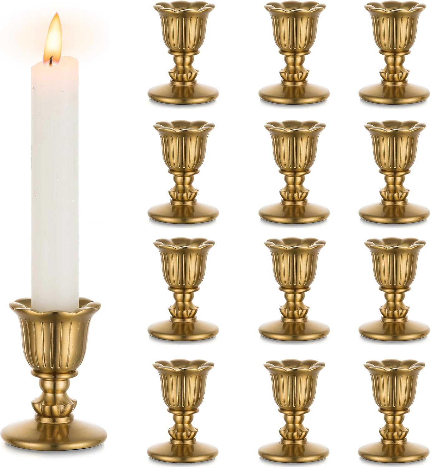 {"about_product": ["Retro Touch: brushed metallic brass colored, the retro candle stick holder adds vintage touch to your space, fit traditional,farmhouse, rustic, victorian style and the like interior decor", "Timeless Elegant Design: gold candle holders with a brushed metal design, slightly shinny and very exquisite. The flower design with vintage pattern highlights the timeless elegance of the candlestick.", "Measurements : small size but weighty and able to hold candles perfectly, this short candle stick holder measures 2.5\" tall, and 2\" wide at botto, fits 0.87\" tapered candle.", "Premium Material: this candle holder for candlesticks is made of premium alloy, for long lasting use; proper heft in this small taper candle holder", "For Any Occasion: vintage decorations for wedding, anniversary, holidays, Christmas, birthday party, home functional and decorative for dining table, living room, coffee table, dinner table, fireplace mantle"], "product_description": null, "product_information": {"ASIN": "B0CNLY4WZH", "Brand": "Romadedi", "Color": "Gold", "Theme": "Festival, Holidays, Wedding", "Material": "Brass, Metal", "Finish Type": "Polished", "Item Weight": "2.68 pounds", "Item Diameter": "0.87 Inches", "Mounting Type": "Tabletop", "Number of Pieces": "12", "Best Sellers Rank": "#23,885 in Home & Kitchen (See Top 100 in Home & Kitchen) #21 in Candlestick Holders", "Product Dimensions": "2\"L x 2\"W x 2.5\"H", "Date First Available": "November 18, 2023"}, "product_details": {"Brand": "Romadedi", "Color": "Gold", "Material": "Brass, Metal", "Finish Type": "Polished", "Product Dimensions": "2"L x 2"W x 2.5"H"}}