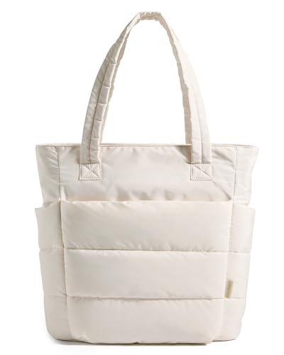 {"about_product": ["The Trend Era of Puffer Bag is Approaching: \"A puffer bag can effortlessly complement various outfits,\" says Brenda Iris, image consultant, stylist, and founder of Mindful Styling in Minneapolis, Minnesota.", "Compact Size: Standard Size: 16.1''L x 6.1''Wx 12.2''H/Capacity 20L and Slim Size - 13.2''L x 5.1''Wx 15.7'H/Capacity 20L, suitable 15.6'' laptops. Small Size - 15''L x 5.1''Wx 11'H/Capacity 18L, suitable 14'' laptops. You can make your choice according to your own preferences.The zipper closure design ensures the safety.", "Ultra Lightweight Material : Standard Size and Slim Size weighs only 0.99 pounds. Small Size weighs only 0.79 pounds. Made of durable, soft and light taslan fabric. The puffer tote bag is easy to carry. Good choice of travel bag.", "Versatile Tote: It can be used as a work bag, laptop bag, gym bag, beach tote bag, casual shoulder bag, or travel bag. Suitable for work, beach, travel, shopping, gym and more occasion", "Satisfaction: Your satisfaction is our greatest motivation, we are committed to providing you the best service. Any quality problems, please feel free to contact us and we will offer you a satisfactory solution"], "product_description": null, "product_information": {"ASIN": "B0CS2Q8KYC", "Department": "Women", "Customer Reviews": "4.7 4.7 out of 5 stars \n\n (4,616)", "Best Sellers Rank": "#158 in Clothing, Shoes & Jewelry (See Top 100 in Clothing, Shoes & Jewelry) #1 in Women's Tote Handbags", "Item model number": "BM0305067AN", "Product Dimensions": "19.3 x 6.3 x 13.8 inches; 15.84 ounces", "Date First Available": "January 11, 2024"}, "product_details": {"Origin": "Imported", "Fabric type": "Polyester fibre", "Care instructions": "Machine Wash"}}