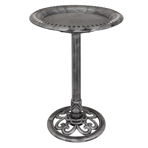 {"about_product": ["28\" PEDESTAL BIRDBATH WITH BASE: Attracts songbirds and butterflies to your outdoor space, adding movement and life to any garden, patio, backyard, or deck. The perfect centerpiece to create a peaceful, nature-filled retreat right at home.", "ELEGANT OUTDOOR ACCENT: Transform your garden or patio with this 28\" bronze pedestal birdbath featuring intricate scrollwork detailing and a timeless finish that complements any landscape.", "INVITES NATURE IN: Provides a serene water source to attract birds and butterflies — turning your yard into a peaceful, living garden display.", "STURDY & STABLE DESIGN: Includes metal ground stakes for added stability, keeping your birdbath secure even in windy conditions.", "BUILT TO LAST: Crafted from durable, weather-resistant materials that maintain their color and charm through every season.", "VERSATILE PLACEMENT: Perfect for gardens, patios, porches, or walkways — a beautiful centerpiece that adds life and elegance to your outdoor décor."], "product_description": "Attract all types of birds to your outdoor living space with the Alpine Corporation Pedestal Birdbath with Scrollwork Base. This stunning antique bronze birdbath captivates a variety of birds and feathered friends while bringing life to any garden, patio, backyard, or deck. Boasting an elegant pedestal design with an exquisite scrollwork base, this birdbath creates a captivating focal point while complimenting the natural beauty of your outdoor sanctuary. It stands at an impressive 28\" for easy bird watching, and the spacious 20\" diameter basin allows multiple small birds to drink, splash, and bathe safely at the same time. Crafted with precision from heavy-duty polypropylene material, this pedestal birdbath has a lightweight design for easy relocation while maintaining stability and durability year after year. Two convenient U-hooks and ground stakes make setup a breeze, and you can customize the base by filling it with gravel or stones, adapting the weight to suit your preferences. With Alpine's 1-year support, you can shop with assurance and buy with confidence.", "product_information": {"ASIN": "B0CSF1MQCS", "Item Weight": "3.74 pounds", "Manufacturer": "Alpine Corporation", "Best Sellers Rank": "#2,456 in Patio, Lawn & Garden (See Top 100 in Patio, Lawn & Garden) #1 in Birdbaths", "Item model number": "TEC116BZ", "Product Dimensions": "20 x 20 x 28 inches"}, "product_details": {}}