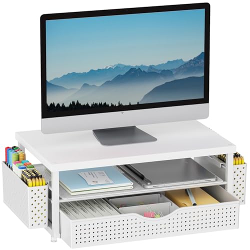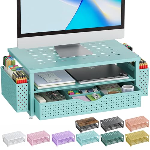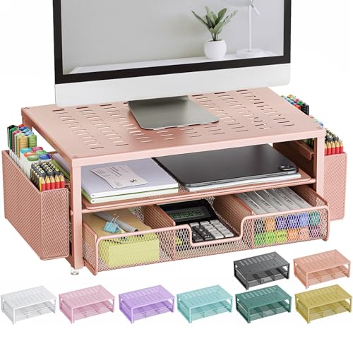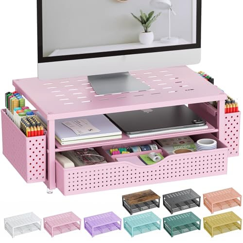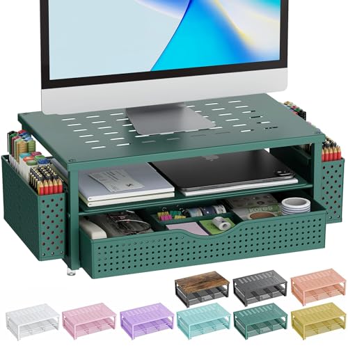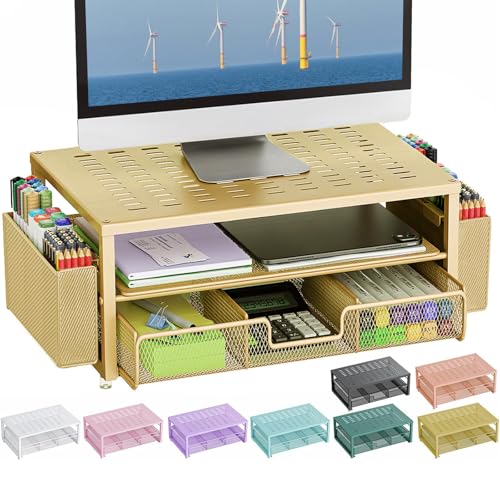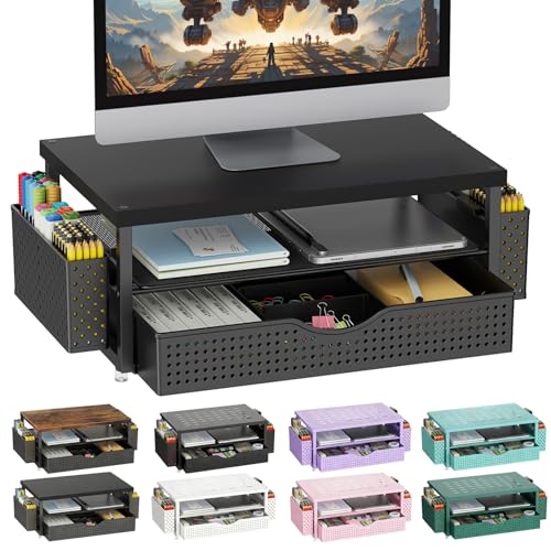 {"about_product": ["【Unique Desk Decor】: The monitor stand has a classic black coating, adding elegance and modernity to your office while being sturdy and practical. allowing you to work in a cozy and tidy environment with greater comfort and efficiency.", "【Improved Work Efficiency】: The monitor riser comes with a sliding drawer and two pen holders. It accommodates various office desk items, saving space. It helps you quickly identify the contents of each compartment, doubling your work speed.", "【Reduced Fatigue】: Elevate your monitor to a comfortable viewing height, relieving pressure on your neck, shoulders, and back, and enhancing comfort and creativity throughout the day.", "【Wide Compatibility】: Monitor Riser / Stand for printer, computer, laptop, notebook. with a ventilation design to prevent overheating. Non-slip rubber pads provide stability during work.", "【Happy Purchase】: Enjoy a 100-day return policy. Contact us with any questions, and we'll provide assistance within 24 hours.(USPTO Patent Application Number: 65268496)"], "product_description": null, "product_information": {"ASIN": "B0CSFH1R36", "Shape": "Rectangular", "Item Weight": "3.76 pounds", "Manufacturer": "gianotter", "Load Capacity": "44 Pounds", "Special Feature": "desk shelf, monitor stand with drawer", "Assembly Required": "Yes", "Best Sellers Rank": "#1 in Computer Racks & Cabinets", "Item model number": "D-3-2", "Product Dimensions": "14.1 x 9.64 x 5.9 inches"}, "product_details": {"Brand": "gianotter", "Color": "Black", "Material": "Alloy Steel", "Finish Type": "Powder Coated", "Item dimensions L x W x H": "14.1 x 9.64 x 5.9 inches"}}