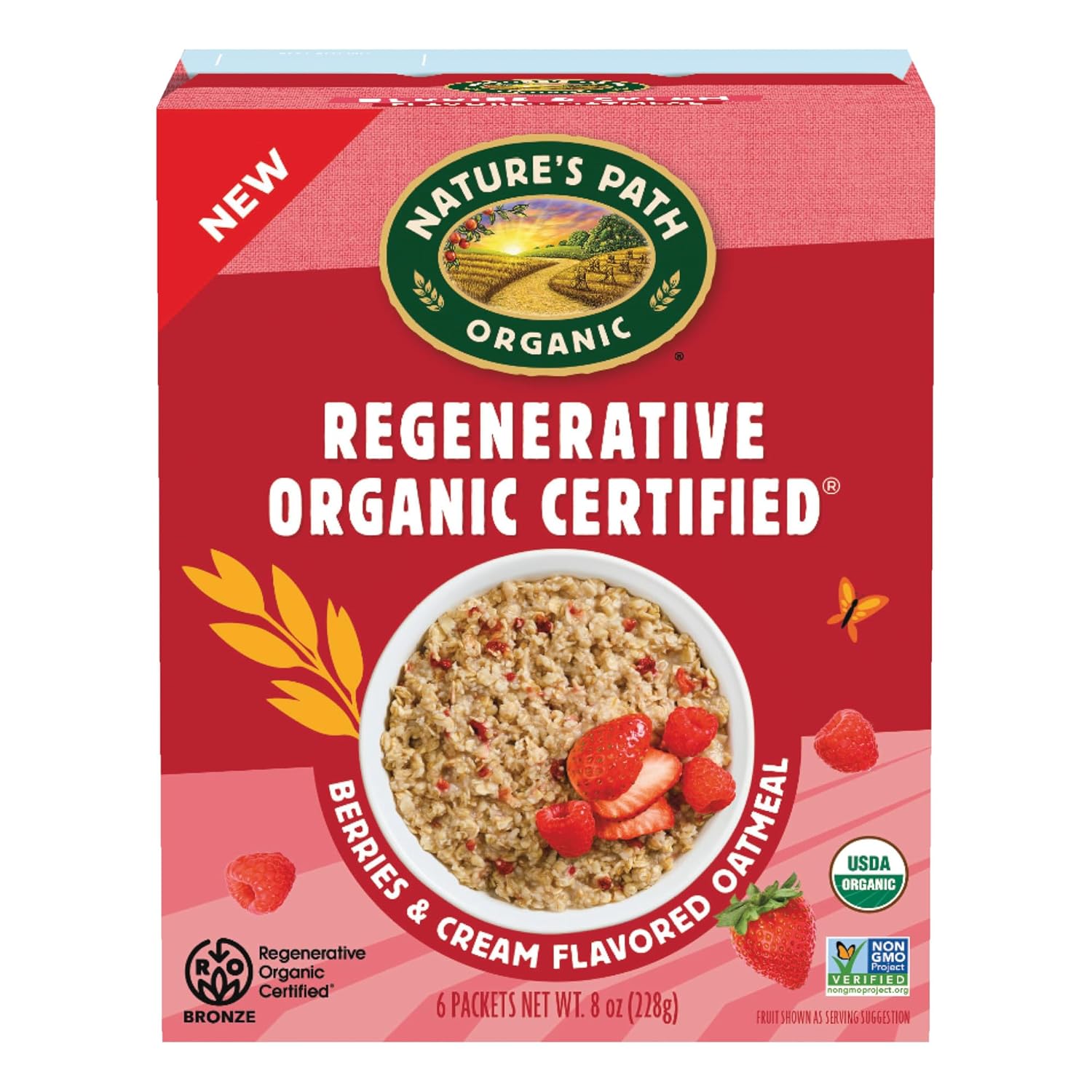 {"about_product": ["Contains: 1 Box of Nature's Path Regenerative Organic Certified Berries & Cream Instant Oatmeal, 8 ounces", "All of our recipes are carefully crafted with only certified USDA organic and Non-GMO ingredients, so that mindful eaters can enjoy a deliciously nutritious oats, with no artificial colors, flavors and preservatives.", "6 single-serve packets of quick cooking Regenerative Organic Certified whole grain oats, filled with a blend of freeze-dried berries.", "Eating whole grains is an essential part of a healthy diet. Whole grain oats are great because of their high fiber levels, and also because they contain loads of antioxidant creating phytochemicals. They’re also an excellent source of vitamins and minerals.", "Each serving contains 30g whole grains, 4g protein and 3g of fiber.", "Our planet, our food and our bodies are all connected. Being mindful about your food and choosing to eat organic means you’re making the best choice for your health, and our planet."], "product_description": "6 single-serve packets of quick cooking Regenerative Organic Certified® whole grain oats, filled with a blend of freeze-dried berries to give you that healthy, nutritious, burst of berry goodness! We believe it’s important to start the day right, and that’s why we created this deliciously tasty oatmeal, filled with simple, whole food, organic and Non-GMO ingredients.", "product_information": {"UPC": "058449241898", "ASIN": "B0CWLRGB42", "Units": "8.0 Ounce", "Manufacturer": "NATURES PATH", "Customer Reviews": "4.2 4.2 out of 5 stars \n\n (34)", "Best Sellers Rank": "#69,222 in Grocery & Gourmet Food (See Top 100 in Grocery & Gourmet Food) #266 in Oatmeal #1,144 in Breakfast Foods", "Item model number": "24189U", "Package Dimensions": "5.71 x 4.61 x 3.66 inches; 8 ounces"}, "product_details": {"Brand": "Nature's Path", "Flavor": "Berries & Cream", "Item Form": "Flaked", "Sub Brand": "Nature's Path", "Age Range (Description)": "Adult"}}