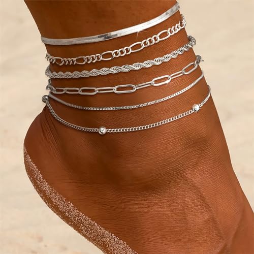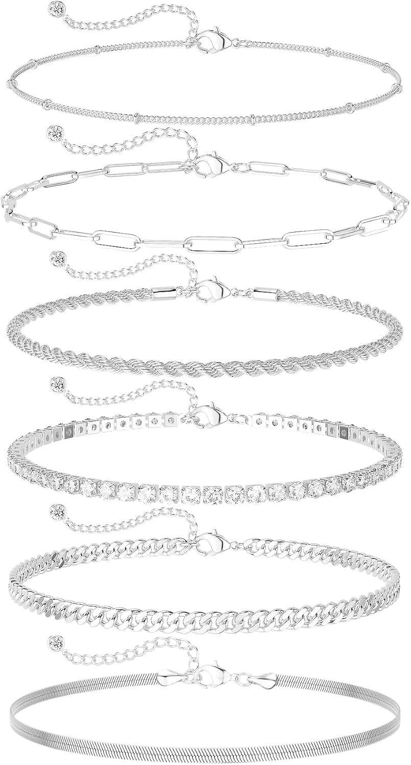 {"about_product": ["Set Contents: Set contains ① Cuban link anklet ② Tennis anklet ③ Herringbone anklet ④ Paperclip Anklet ⑤ Rope Anklet ⑥ Satellite Anklet. These anklets are suitable for layering and can be worn alone.", "ANKLETS SIZE: Each anklet is 8.5\" + 2.5\" extender. Strong lobster clasp design, allowing you to easily adjust the length. Suitable for women and teens.", "PREMIUM MATERIAL: S925 silver plated Plated anklet, lead free, nickel free, and hypoallergenic. Great for sensitive skin and all-day wear.", "PACKAGE AND OCCASION: These dainty silver anklets come in a cute gift box and make a great gift. Suitable for any occasion, perfect for weddings, engagements, etc.", "Exceptional Service: DEARMAY offers superior service to ensure you have a delightful shopping experience. Should you have any questions, please do not hesitate to contact us."], "product_description": "Adjustable S925 silver plated Plated Anklet Waterproof", "product_information": {"ASIN": "B0CYC3DWSR", "Department": "womens", "Manufacturer": "DEARMAY", "Customer Reviews": "4.6 4.6 out of 5 stars \n\n (758)", "Best Sellers Rank": "#43,534 in Clothing, Shoes & Jewelry (See Top 100 in Clothing, Shoes & Jewelry) #22 in Women's Anklets", "Product Dimensions": "8.5 x 3 x 1 inches; 0.71 ounces", "Date First Available": "March 18, 2024"}, "product_details": {"Gem type": "Cubic Zirconia", "Material": "Brass Plated with Silver", "Chain type": "Cuban Chain", "Clasp type": "Lobster", "Metal type": "Brass", "Item type name": "Anklets"}}
