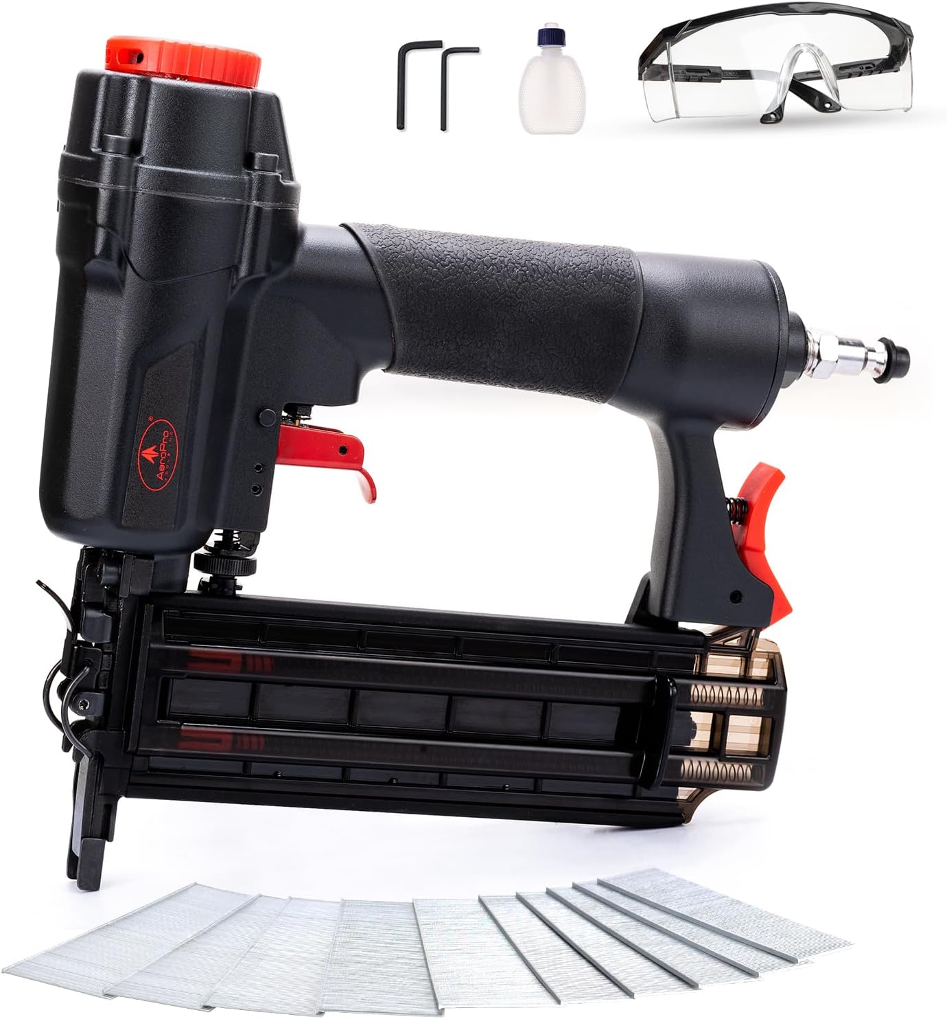 {"about_product": ["【Pneumatic Brad Nailer】The pneumatic brad nail gun drives 18 Gauge Brad Nails 5/8 inch up to 2 inch in length. 500 pcs 1-1/5\" nails and 500 pcs 2\" nails are included. Please note it needs air compressor to drive. Please use 18 gauge nails only, or else it may damage the nailer. It's not 2-in-1 brad nailer.", "【Tool-free Deep Adjustment】Front-mounted tool-free depth adjustment for easier nail depth control, simply turn to achieve depth adjustment.", "【Tool-free Jam Clearing】Removable cover plate for easy tool-free jam clearing. The 360° rotating exhaust system keeps contaminants away from the work area.", "【Visible Magazine】Semitransparent engineering plastic magazine allows for clear visibility of remaining nails. Comfortable handle, lightweight design, make the work more effortless.", "【Versatile Use】Ideal for DIY projects, building pet houses, carpentry, interior decoration installations, flooring, molding, roofing, picture frames, door and window installations, and more."], "product_description": null, "product_information": {"ASIN": "B0CZHLV5H1", "Size": "AF50 Brad Nailer", "Brand": "AEROPRO", "Color": "Black", "Item Weight": "3.58 pounds", "Manufacturer": "Jax Technology Co.,Ltd", "Material Type": "Alloy Steel, Aluminum, Metal, Stainless Steel", "Number of Items": "1", "Best Sellers Rank": "#70,883 in Tools & Home Improvement (See Top 100 in Tools & Home Improvement) #45 in Power Brad Nailers", "Item model number": "AF50", "Package Dimensions": "11.26 x 10 x 2.6 inches", "Number of Fasteners": "1000", "Date First Available": "June 25, 2024", "Manufacturer Part Number": "AF50"}, "product_details": {"Brand": "AEROPRO", "Color": "Black", "Style": "Brad Nailer", "Material": "Alloy Steel, Aluminum, Metal, Stainless Steel", "Number of Fasteners": "1000"}}
