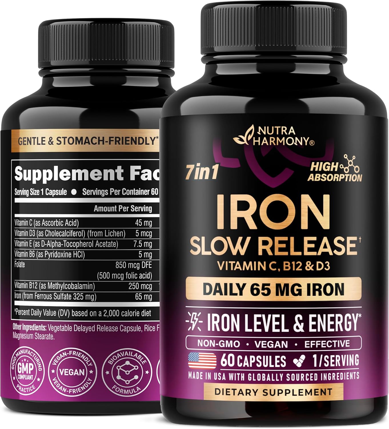 {"about_product": ["Slow Release Iron 65mg — Your recommended daily dose of Iron in highly bioavailable ferrous sulfate form is crafted to support your body's essential functions and maintain optimal health. Our slow-release iron supplement is designed to provide iron 65mg in a form that ensures optimal absorption, making it an ideal iron supplement for women & men.", "7-in-1 Complex — Iron with Vitamin C, B12 & D3. Enhanced with vitamin C to support iron absorption and is powered with essential vitamins, maximizing benefits for your health. Our iron supplement with vitamin C is perfect for those looking for iron supplements with enhanced bioavailability. Our iron supplement 65 mg is also suitable for vegan iron supplements enthusiasts, providing a comprehensive iron vitamins solution that is gentle and stomach-friendly.", "Gentle & Stomach-friendly — Crafted with a delayed-release technology, our iron supplement releases in the intestines, reducing side effects and enhancing absorption. This gentle iron supplement for women and men ensures you receive the full benefits of the iron vitamin C complex without the common digestive issues associated with iron supplements. The slow-release iron technology makes it a perfect choice for those seeking a gentle iron experience.", "Made in USA With Globally Sourced Ingredients — Rest assured! A slow-release iron supplement is proudly manufactured in the USA under strict quality control standards, Third Party Tested & GMP certified. We adhere to rigorous procedures to ensure every batch's safety, purity, and efficacy. We use the most potent forms of each component to achieve maximum effect. Highest quality & purity to ensure the best results!", "Trustworthy Service — We are committed to providing exceptional customer service and transparency with NUTRAHARMONY’s carefully selected Iron! With our iron supplements for men & women, you can trust that you're receiving a premium-quality supplement backed by scientific research and dedicated customer support!"], "product_description": null, "product_information": {"ASIN": "B0D47FBQP6", "Manufacturer": "Distributed by Nutra Harmony LLC", "Customer Reviews": "4.5 4.5 out of 5 stars \n\n (1,190)", "Best Sellers Rank": "#7,372 in Health & Household (See Top 100 in Health & Household) #29 in Iron Mineral Supplements", "Item model number": "NH-IRNCPS60", "Package Dimensions": "4.49 x 1.93 x 1.89 inches; 2.12 ounces", "Date First Available": "May 15, 2024"}, "product_details": {"Brand": "NUTRAHARMONY", "Flavor": "Unflavored", "Item Form": "Capsule", "Unit Count": "60.0 Count", "Primary Supplement Type": "Iron"}}