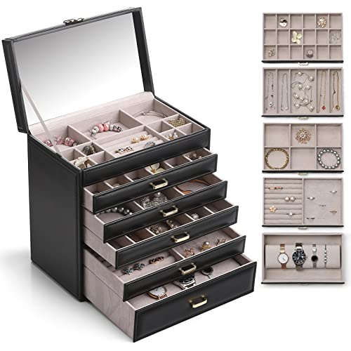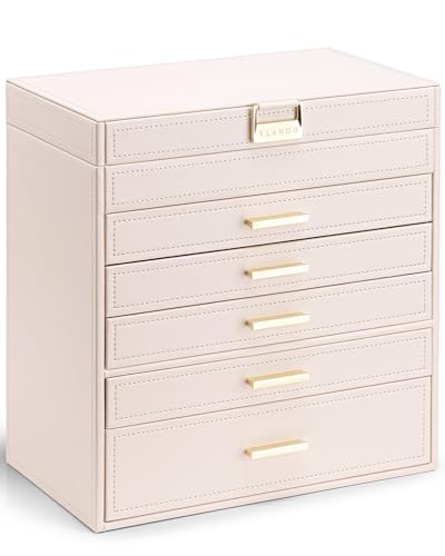 {"about_product": ["6 LAYERS OF LARGE CAPACITY- Vlando jewelry box has multifunctional storage compartment, drawer with 18 grids, 6 grids, for rings & ear studs, necklaces, bracelets, watches. It offers sufficient storage space for all your jewelry, and finally lets you store your jewelry properly.", "SIMPLE, MODERN AND STYLISH - Large jewelry organizer has a simple and natural look that suits most styles. With a beautiful appearance, it is not only a practical jewelry box, but also a wonderful decoration for your room.", "Necklack DESIGN - Makes it easy to put on your jewelry and check how you look when you get dressed up in the morning. 5 drawers can be completely disassembled. In addition, the dividers in the drawers are removable. You can freely design partitions according to your needs.", "EXCELLENT LEATHER AND NOBLE WORKMANSHIP - Jewelry box for Women is made of high quality synthetic leather and eco-friendly fiberboard. The interior is covered with soft velvet to take care of jewelry; the edge of the jewelry box has fine seams for a more elegant feeling.", "PERFECT GIFT IDEA - Gift this well-crafted original design jewelry holder to your loved ones for their birthday or anniversary to surprise them!", "FSC-CERTIFIED - Jewelry box's frame is made of Fsc-Certified wood"], "product_description": null, "product_information": {"ASIN": "B0D4C4SG8W", "Brand": "Vlando", "Color": "Apricot White", "Shape": "Square", "Style": "Modern", "Material": "Leather", "Finish Type": "Textured", "Item Weight": "7.06 pounds", "Finish types": "Textured", "Manufacturer": "Vlando", "Warranty Type": "No Warranty", "Inner Material": "Velvet", "Number of Items": "1", "Special Feature": "Adjustable", "Target Audience": "Women", "Best Sellers Rank": "#21,300 in Clothing, Shoes & Jewelry (See Top 100 in Clothing, Shoes & Jewelry) #120 in Jewelry Boxes", "Number of Drawers": "6", "Batteries required": "No", "Product Dimensions": "6\"D x 11\"W x 11\"H", "Jewelry Storage Type": "Jewelry Box", "Number of Compartments": "11", "Recommended Uses For Product": "Jewelry Box"}, "product_details": {"Brand": "Vlando", "Color": "Apricot White", "Shape": "Square", "Style": "Modern", "Material": "Leather", "Finish Type": "Textured", "Special Feature": "Adjustable", "Target Audience": "Women", "Product Dimensions": "6"D x 11"W x 11"H", "Recommended Uses For Product": "Jewelry Box"}}