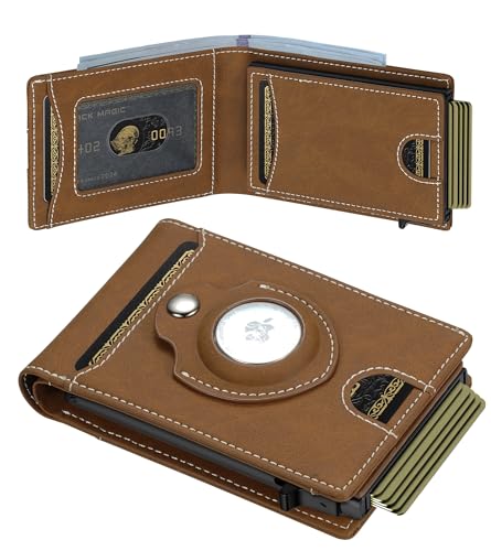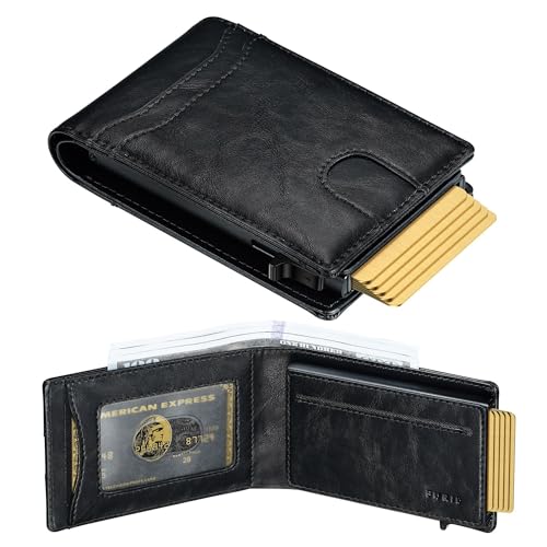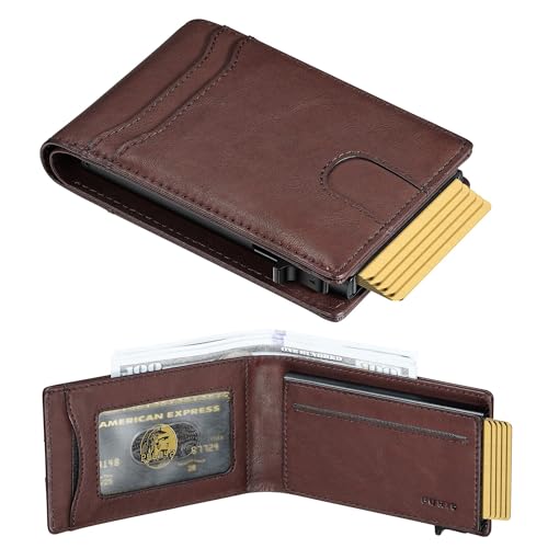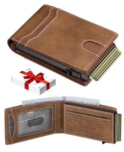 {"about_product": ["Upgrad Design Wallet: The smart Wallet For Men Slim sets the trend with its Automatic ejection clip design,ensuring cards stay securely in place without the worry of accidental drops. Leather fully wrapped card case, perfect fit, ensure that leather and card case never separate.The sturdy cavity card case guarantees that the wallet never deforms compared to traditional wallets.", "Advanced RFID Protection: Shield your credit cards, ID, and passport from unauthorized RFID scanning with our state-of-the-art blocking technology.", "Slim Wallet: The minimalist wallet ensures it remains slim and lightweight, facilitating easy daily carry.", "Large Capacity: Effortlessly store up to 10+ cards(1 ID windows included) and dozen cash in the Smart Wallet.5-6 cards can be inserted in outside of the aluminum champer.The meticulously crafted sliding button grants you effortless and swift access to the cards you need.", "Gift Ideal: Great Gift for father boyfriend husband at birthday, Anniversary Christmas, Valentine day, fathers day, Festivals. The wallet is suitable for everyday carry, travel accessory, outdoor adventure ,hiking trip, business travel, graduation ceremony."], "product_description": null, "product_information": {"ASIN": "B0D78Y9TSF", "Department": "Men", "Item Weight": "3.84 ounces", "Manufacturer": "furid", "Best Sellers Rank": "#6,591 in Clothing, Shoes & Jewelry (See Top 100 in Clothing, Shoes & Jewelry) #61 in Men's Wallets", "Item model number": "J002-6", "Product Dimensions": "0.6 x 3.9 x 2.7 inches"}, "product_details": {"Brand": "furid", "Color": "Brown Leather", "Style": "Minimalist", "Pattern": "Solid", "Material": "Leather"}}