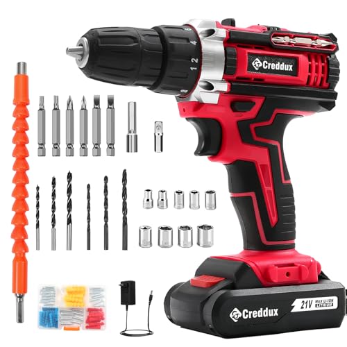 {"about_product": ["?[Power Drill Cordless] 21V 1.5AH power drill consistent performance whether you're drilling into wood, metal, plastic or masonry. Variable speed settings (0-350rpm and 0-1350rpm) allow you to match the speed of the drill to the task at hand, ensuring accuracy and control for every project.", "?[18+1 Position Clutch] 18+1 torque settings provide precise control for driving in/out screws to prevent stripping, and for drilling into wood, ceramics, plastics and even metal with ease. This helps to prevent sinking a screw too deep, stripping a screw head or even breaking a screw shaft.", "?[Hand drill Kit for Home Repair] Never let a dead battery slow you down. Our cordless drill set includes a high-capacity battery that provides extended run time so you can tackle larger projects without frequent recharging, and the high-quality components ensure long-lasting performance and reliability, making this drill a dependable addition to your toolbox.", "?[Comfort & Lightweight design] Power drill cordless is equipped with a soft rubber over-mold handle to offer maximum user comfort and minimize vibration. The built-in LED light illuminates your workspace, providing better visibility in dark or confined areas, ensuring you can work accurately in any condition. The balancer on the top helps maintain horizontal accuracy.", "?[What you will receive] The package contains 1 x 21v cordless drill, 1 x charger, 1 x magnetic flexible shaft, 1 x magnetic bit tip holder, 6 x brad point drill bits, 6 x screwdriver bits, 9 x sockets, 1 x drywall anchor kit. A product manual is also included."], "product_description": null, "product_information": {"ASIN": "B0D7D4BKNL", "Brand": "Creddux", "Color": "Blue Kit", "Speed": "1350 RPM", "Style": "Drill", "Voltage": "21 Volts", "Amperage": "2 Amps", "Material": "Plastic", "Batteries": "1 Lithium Ion batteries required. (included)", "Drill Type": "Basic Drill", "Is Electric": "Yes", "Item Weight": "3.72 pounds", "Part Number": "Cre602", "Manufacturer": "Creddux", "Power Source": "Battery Powered", "Special Feature": "Variable Speed", "Battery Capacity": "1.5 Amp Hours", "Number of Speeds": "2", "Special Features": "Variable Speed", "Battery Cell Type": "Lithium Ion", "Best Sellers Rank": "#105,482 in Tools & Home Improvement (See Top 100 in Tools & Home Improvement) #211 in Power Drill Drivers", "Product Dimensions": "7.8\"L x 7.4\"W x 2\"H", "Batteries Included?": "Yes", "Batteries Required?": "Yes", "Included Components": "Battery Charger, 84 pcs Drill Accessories", "Date First Available": "June 19, 2024", "Maximum Rotational Speed": "1350 RPM"}, "product_details": {"Brand": "Creddux", "Voltage": "21 Volts", "Amperage": "2 Amps", "Power Source": "Battery Powered", "Maximum Rotational Speed": "1350 RPM"}}