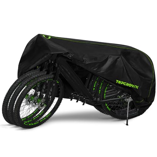 {"about_product": ["Fabric Characteristics - Topcrown bike cover uses 210D fabric combined with a hydrophobic coating, PU waterproof coating, and anti-UV coating, three core technologies to ensure excellent protection for bicycles. The fabric just has 80 GSM (g/m²), but its multi-layered design enables it to withstand water pressure of up to 3000mmH₂O, striking an excellent balance in water resistance, sturdiness, and lightweight.", "Large Size - XL Size for 1 bike: 79'' L x 28'' W x 43'' H, XXL Size for 2 bikes: 83'' L x 37'' W x 43'' H, XXXL Size for 3 bikes: 87'' L x 43'' W x 47'' H, easily covering bike up to 29\", providing comprehensive protection for your bike, enabling you to easily handle rain, sunlight, UV rays, dust, dirt, and other pollutants", "Detail Design - The elastic band at the bottom, along with the front and rear wheel buckles, allows you to secure the bike cover more effectively, providing better wind resistance. The woven nylon lock hole offers better protection for the paint, while metal lock holes can easily scratch the surface.", "Innovative Design - Unlike the outdated designs of traditional bicycle covers, Topcrown boldly incorporates green elements. The integration of green accents, such as the pull tabs, stitching, brand logo, and lock hole with the black fabric, creates a stylish and simple overall appearance that aligns well with our brand's commitment to promoting environmental conservation.", "Easy Carry Easy Store - We provide a storage bag to help you better organize the bicycle cover. The cover is designed for static storage (Warehouse/Courtyard/Garage/Roadside) only, NOT suitable for transport storage (Cars/RVs/Boats)"], "product_description": null, "product_information": {"ASIN": "B0D8Y5F2V6", "Size": "XL Size for 1 bike", "Shape": "rectangular", "Style": "Eco-Friendly/Minimalist", "Item Weight": "14 ounces", "Part Number": "Bike Cover-001", "Closure Type": "Buckle, Zipper", "Manufacturer": "Topcrown", "Best Sellers Rank": "#1,141 in Sports & Outdoors (See Top 100 in Sports & Outdoors) #1 in Bike Covers", "Item model number": "Z2024070601", "Product Dimensions": "79 x 28 x 43 inches", "Batteries Included?": "No", "Batteries Required?": "No", "Included Components": "Bike Cover * 1, Storage Bag * 1", "Date First Available": "July 6, 2024", "Item Package Quantity": "1"}, "product_details": {"Brand": "Topcrown", "Color": "210D Black+Green", "Material": "210D Oxford Fabric (Lab Data: 80 g/m², 3000mmH₂O)", "Item Weight": "14 Ounces", "Water Resistance Level": "Water Resistant"}}