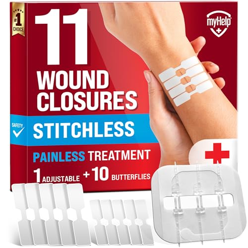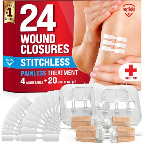 {"about_product": ["QUICK AND PAINLESS — MyHelp emergency butterfly bandages for wound closure keep the wound closed providing it with strong and secure support. These emergency wound closure strips help to heal small cuts in days and protect the wound from exposure.", "FIRST AID KIT MUST-HAVE — The wound closure kit includes all you need to close the wound effectively. It comes with 20 butterfly stitches bandages, 4 laceration closure strips, eight cleaning wipes, and four adhesive dressings. All instruments are individually packed and made of hypoallergenic materials.", "STITCHLESS — Having an emergency laceration kit on hand may save you a trip to the ER and reduce secondary trauma. Butterfly closure bandages are a must-have for those living far away from a hospital, working on a farm, and who like outdoor activities.", "EASY TO APPLY AND REMOVE — MyHelp emergency laceration closures are designed to be easy to use which makes them ideal for kids. Following the instructions, you can apply or remove butterfly strips for wound closure in seconds.", "REDUCE SCARRING — Unlike traditional stitches, butterfly stitches for wounds thanks to their non-invasive technique go without any punctures. In this way, by using MyHelp kit the chances of infection are reduced, and the formation of scarring is minimized.", "MIX PACK — You’ll get three types of first aid wound closure devices that allow you to use them on various types of wounds. MyHelp butterfly sutures — the #1 choice for your first aid kit!"], "product_description": null, "product_information": {"ASIN": "B0DF891X52", "Manufacturer": "MYHELP", "Customer Reviews": "4.6 4.6 out of 5 stars \n\n (955)", "Best Sellers Rank": "#1,569 in Industrial & Scientific (See Top 100 in Industrial & Scientific) #1 in Butterfly Stitches", "Package Dimensions": "5.87 x 5.2 x 0.94 inches; 2.12 ounces", "Date First Available": "August 26, 2024"}, "product_details": {"Size": "Mix Pack", "Brand": "MYHELP", "Style": "24-Pack", "Material": "Polyurethane (PU)", "Sterility Rating": "Sterile"}}