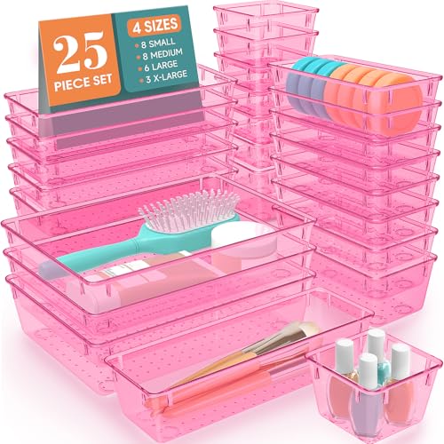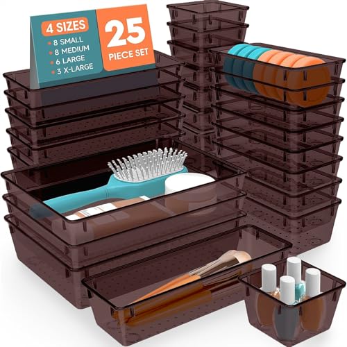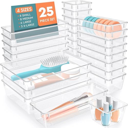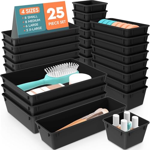 {"about_product": ["Various Storage Options: These multi-functional drawer divider trays are suitable for use at home or in the office; suitable for all drawers, such as vanity/bathroom/kitchen/office, for organizing cosmetics, jewelry, accessories, office supplies, etc", "4 Different Combinations of Sizes: The drawer organizer includes 25 storage bins of 4 different sizes; includes: 9 x 6 x 1.8 inches (3 pcs), 9 x 3x 1.8 inches (6 pcs), 6 x 3 x 1.8 inches (8 pcs), 3 x 3 x1.8 inches (8 pcs)", "Non-Slip and Durable: Prevents the tray from moving side to side when the drawer opens and closes", "Stackable Storage: These organizers can be stacked on top of each other to increase storage space when in use, and can be easily stowed away when not in use, taking up less space", "Easy Cleaning: Our desk drawer organizers simply need to be wiped down with a damp cloth or rinsed with water to keep it clean for continued use"], "product_description": null, "product_information": {"ASIN": "B0DLKNDQ7D", "Brand": "SpaceHacks", "Color": "Clear Black", "Finish": "Polished", "Material": "Plastic", "Unit Count": "25 Piece", "Finish Type": "Polished", "Item Weight": "2.26 pounds", "Manufacturer": "SpaceHacks", "Number of Items": "25", "Special Feature": "Lightweight", "Special Features": "Lightweight", "Best Sellers Rank": "#577 in Automotive (See Top 100 in Automotive) #2 in Tool Trays #3 in Bathroom Sink Vanity Trays", "Product Dimensions": "9\"D x 6\"W x 1.8\"H", "Batteries Required?": "No", "Date First Available": "December 20, 2024", "Item Package Quantity": "1", "Specific Uses For Product": "Cosmetics"}, "product_details": {"Brand": "SpaceHacks", "Color": "Clear Black", "Material": "Plastic", "Unit Count": "25 Piece", "Finish Type": "Polished", "Item Weight": "1.03 Kilograms", "Special Feature": "Lightweight", "Product Dimensions": "9"D x 6"W x 1.8"H", "Number of Compartments": "25", "Specific Uses For Product": "Cosmetics"}}