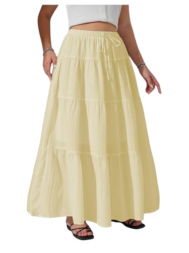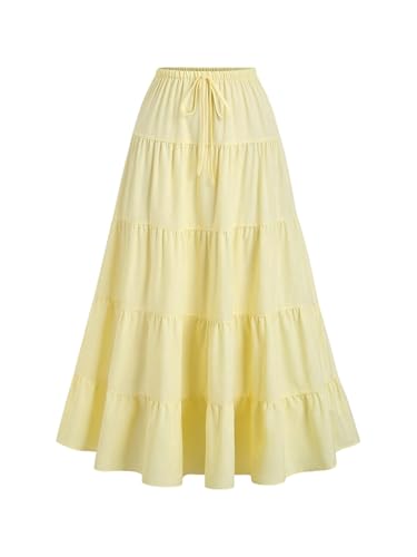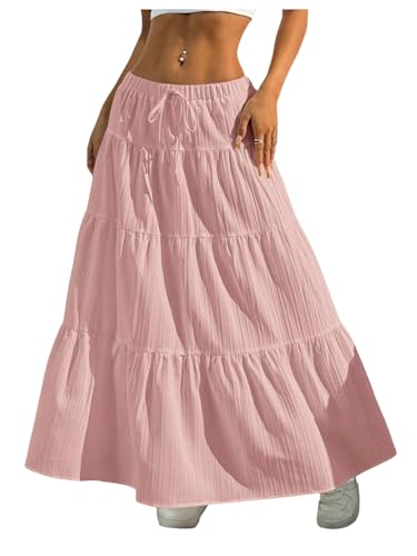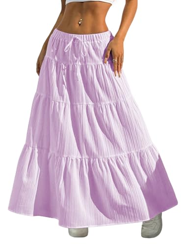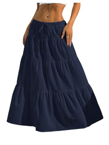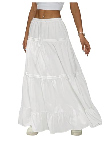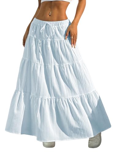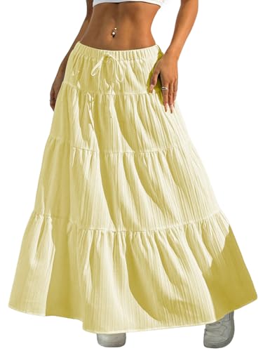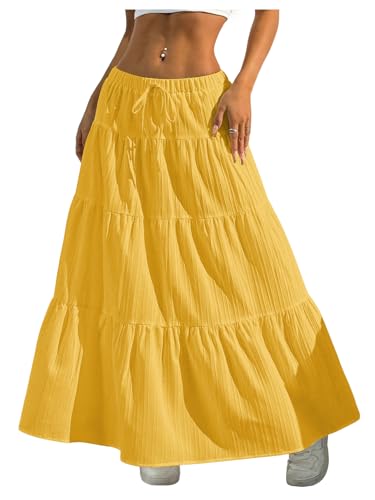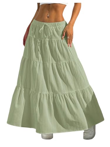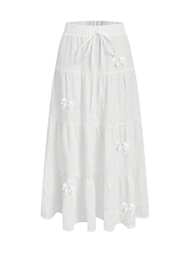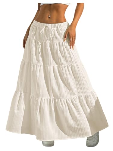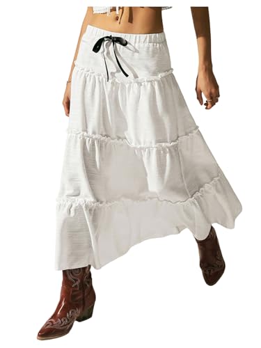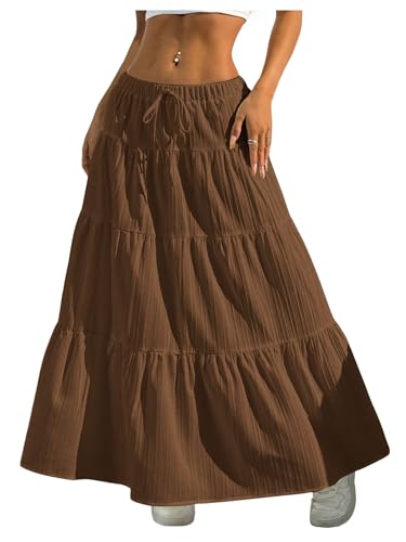 {"about_product": ["Soft fabric and comfortable material with no stretch", "Boho flared ruffle long skirt for women, ruched, ruffle hem, A line, low waist, bow front decor, coquette, chic and comfy, plain color, layered, summer casual skirt", "Perfectly be paired with basic shirt, sweaters, cardigans, crop tops, vests, coats, jackets, winter leggings, stockings, boots and sneakers", "Perfect for outdoor and indoor activities, dating, holiday, shopping, weekend, street, daily wear and so on/", "Please refer to size guide carefully before purchasing at below description(Tips:The Product Measurement is clothes size, NOT human body size)"], "product_description": null, "product_information": {"ASIN": "B0DLVX9JDC", "Department": "womens", "Customer Reviews": "4.3 4.3 out of 5 stars \n\n (304)", "Product Warranty": "For warranty information about this product, please click here", "Best Sellers Rank": "#22,639 in Clothing, Shoes & Jewelry (See Top 100 in Clothing, Shoes & Jewelry) #24 in Women's Weekend Skirts", "Date First Available": "November 4, 2024"}, "product_details": {"Origin": "Imported", "Fabric type": "98% Polyester, 2% Elastane", "Closure type": "Pull On", "Care instructions": "Machine Wash"}}
