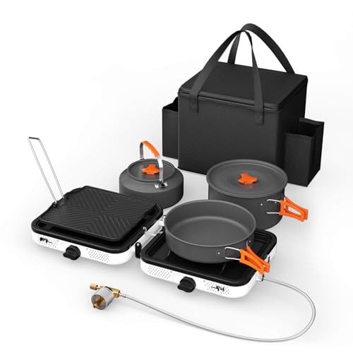 {"about_product": ["【Compact Folding Design for Easy Travel】This folding camp stove collapses to just 10.2\" x 9\" x 2.4\", weighs 8.9 lbs, and includes a durable carry bag—making it ultra-portable for any trip. Whether packed in a backpack or tossed in your trunk, it’s a compact essential for outdoor cooking on the go.Perfect for campers needing space-saving gear.", "【20,000 BTU Dual Burners with Flexible Use】Featuring two 10,000 BTU burners, this 2 burner propane camping stove supports simultaneous cooking with pans up to 10\". Boil water, grill meat, or sauté veggies at the same time with full heat control on each side.Cook more meals, save more time at camp.", "【Durable Build with Reliable Stability】Made with stainless steel burners, a heat-resistant coated shell, and non-slip feet, this propane portable stove stays stable on uneven ground and resists outdoor wear. Built to last through every adventure.Rugged enough for real outdoor use.", "【Quick Ignition & Adjustable Flame Control】The integrated piezo ignition system lights instantly—no lighter or match needed. Stepless knobs allow you to fine-tune each burner from low simmer to high heat, ensuring precise cooking in any weather.Simple startup, total control every time.", "【Versatile for Camping, BBQs】From camping and hiking to BBQs and road trips, this camping stove with griddle performs wherever you set it up. Use both burners for breakfast, dinner, or anything in between.One stove, endless outdoor meals.", "【All-in-One Cooking Kit with Carry Bag】Includes a protable cookware set: frying pan, pot, kettle and a griddle, plus adapters for isobutane, and propane. The carry bag features dedicated slots for gas tanks on both sides, keeping your gear organized. This portable propane camp stove makes setup, transport, and cooking effortless.Pack smart, cook anywhere."], "product_description": null, "product_information": {"ASIN": "B0DQD1M7VQ", "Brand": "Hisencn", "Material": "Alloy Steel, Aluminum, Ceramic, Stainless Steel", "Fuel Type": "Butane, Isobutane, Liquefied Petroleum Gas, Propane", "Item Weight": "8.6 pounds", "Manufacturer": "Hisencn", "Power Source": "Gas Powered", "Best Sellers Rank": "#31,633 in Sports & Outdoors (See Top 100 in Sports & Outdoors) #59 in Camping Stoves", "Item model number": "H-77139-B", "Product Dimensions": "10\"L x 9\"W x 4.3\"H", "Date First Available": "December 13, 2024", "Maximum Energy Output": "20000 British Thermal Units"}, "product_details": {"Brand": "Hisencn", "Material": "Alloy Steel, Aluminum, Ceramic, Stainless Steel", "Fuel Type": "Butane, Isobutane, Liquefied Petroleum Gas, Propane", "Item Weight": "8.6 Pounds", "Power Source": "Gas Powered", "Product Dimensions": "10"L x 9"W x 4.3"H", "Maximum Energy Output": "20000 British Thermal Units"}}