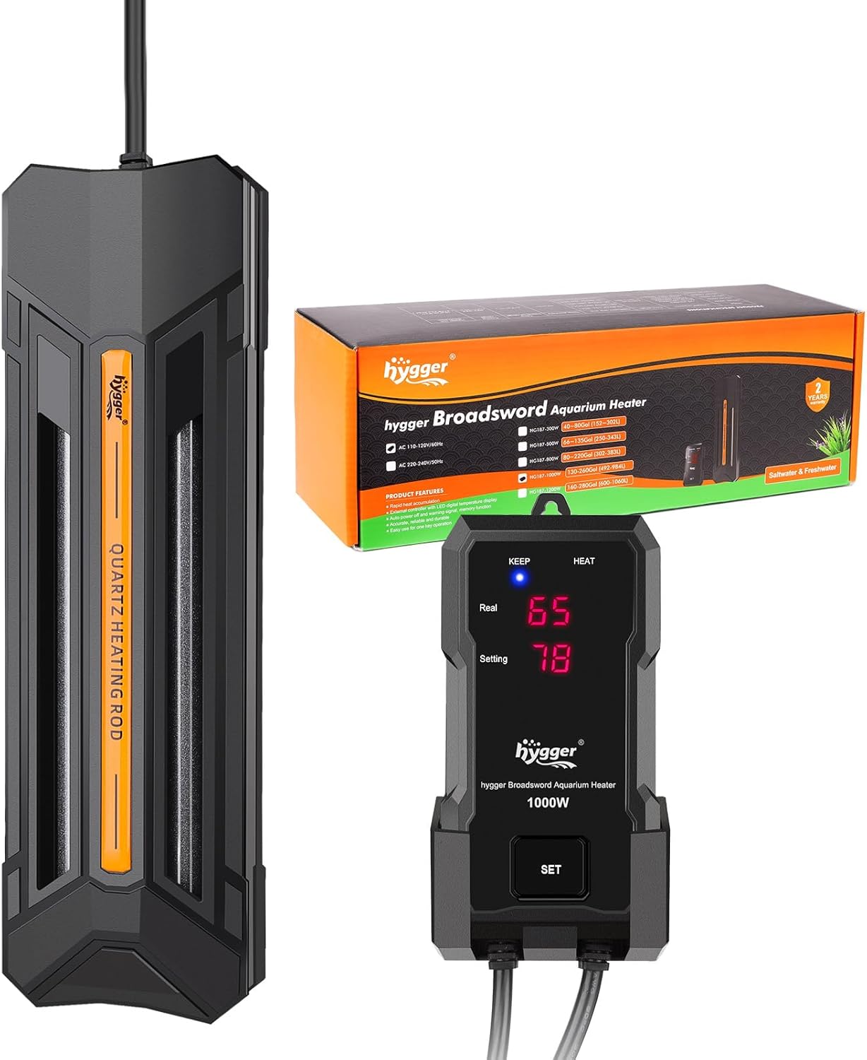 {"about_product": ["300 WATT AQUARIUM HEATERS: 300 watt aquarium heaters are suitable for 40-80 gallon freshwater and saltwater aquariums, turtle tanks and ponds. Heater rod footprint 10.6\"x3.3\"x1\". voltage 110-120V. Power cord from heater rod to controller measures 6.2ft in length. Controller to plug measures 3.9ft in length", "SAFETY TRIPLE PROTECTION: If the water temp exceeds 94°F or below 59°F or heater rod dips too low, fish tank heater will automatically shut off the power and stop heating and the display will flash error code and sound beeping alarm to help alert you to the problem, keeping you pet fish healthy in time. Over-temperature protection, low-temperature protection and out of water protection to void cooking fish!", "RAPID HEATING AND MAINTAIN AT CONSTANT LEVEL: hygger aquarium heaters are made from dual quartz glass heater tubes and nickel-chromium heating wire which offers durability and outstanding heat conductivity, ensuring rapid heating and maintain a consistent temperature. Plastic casing that protects fish from touching it and burning themselves. It is ideal for use in tanks where large and strong fish or even water turtles are kept", "EASY TO SET TEMPERATURE: fully submersible aquarium heater with controller can be easily adjust the temperature setting without getting your hands wet. To set the desired temperature, keeps pushing the set button and it cycle through all the set temperatures. Adjustable temperature between 59°F and 93°F, which means that the fish heater can be used in treating various fish diseases, including white spots", "LED DIGITAL DISPLAY: Easy to read digital display showing the current and set temperature which allows you to monitor water temperature at a glance. Red indicator light shows when water is heating and turns into blue that the heater is on standby"], "product_description": null, "product_information": {"ASIN": "B0DQL5YL6X", "Size": "300W for 40-80 Gallon", "Color": "Black", "Material": "Nickel Chromium, Plastic, Quartz", "Brand Name": "hygger", "Item Weight": "2.16 pounds", "Manufacturer": "hygger", "Date First Available": "December 26, 2024", "Item Dimensions LxWxH": "10.6 x 3.3 x 1 inches", "Target Audience Keyword": "Fish and Aquatic, fish", "Item Package Dimensions L x W x H": "13.7 x 4.69 x 4.45 inches"}, "product_details": {"ASIN": "B0DQL5YL6X", "Manufacturer": "hygger", "Customer Reviews": "4.5 4.5 out of 5 stars \n\n (117)", "Best Sellers Rank": "#27,440 in Pet Supplies (See Top 100 in Pet Supplies) #56 in Aquarium Heaters", "Product Dimensions": "10.6 x 3.3 x 1 inches; 2.16 Pounds", "Date First Available": "December 26, 2024"}}