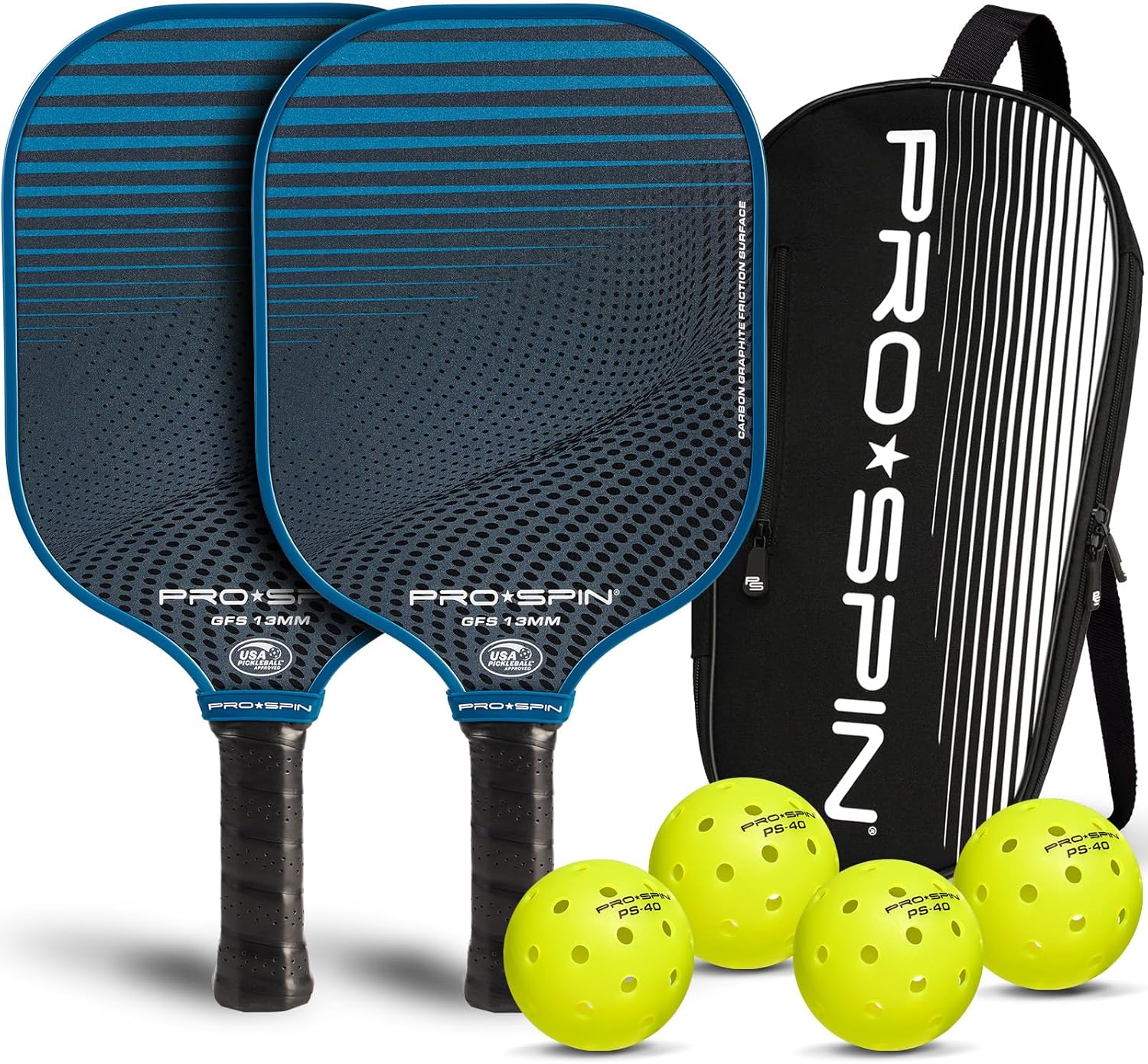{"about_product": ["USAPA APPROVED COMPLETE PICKLEBALL SET: This set of 2 graphite paddles is USAPA approved and built for all skill levels. Designed with cushioned, non-slip grips for comfort and endurance, these pickleball rackets deliver reliable power, control, and balance", "LIGHTWEIGHT GRAPHITE CARBON PADDLES: Each pickleball paddle features advanced 3-layer construction with a durable edge guard, graphite carbon surface, and 13mm honeycomb core. This design ensures spin, power, precision, and lasting durability for every game.", "NON-SLIP SWEAT-ABSORBING CUSHION GRIP: Play longer with a cushioned, sweat-absorbing grip that prevents slipping. These pickleball paddles provide a secure hold and excellent wrist movement, keeping you comfortable during long matches.", "PERFECT PICKLEBALL KIT & GIFT IDEA With 2 graphite paddles, indoor and outdoor balls, paddle cover, and carry bag, this complete pickleball set makes a thoughtful gift for women, men, or kids who love active fun, family games, or competitive play.", "DURABLE PADDLES WITH WARRANTY & GUARANTEE Designed with a reinforced edge guard and premium construction, these pickleball paddles last match after match. Backed by PRO-SPIN’s 1-year warranty and 100% satisfaction guarantee for lasting reliability."], "product_description": "", "product_information": {"UPC": "850040710465", "ASIN": "B0DSWJHG9H", "Size": "2-Player Set", "Brand": "PRO-SPIN", "Color": "2-Player Set | Blue", "Sport": "Pickleball", "Style": "Blue", "Material": "Carbon Graphite", "Grip Size": "Standard", "Brand Name": "PRO-SPIN", "Model Name": "2-Player GFS-13 Pickleball Set", "Skill Level": "Beginner/Intermediate", "Manufacturer": "PRO-SPIN® SPORTS", "Frame Material": "Graphite Carbon Friction Surface with Polypropylene Honeycomb Core", "Package Weight": "1.06 Kilograms", "Shaft Material": "Carbon Graphite", "Suggested Users": "All Ages", "Best Sellers Rank": "#1,076 in Sports & Outdoors (See Top 100 in Sports & Outdoors) #3 in Pickle-Ball Paddles", "Product Dimensions": "16.9\"L x 9.1\"W", "Included Components": "2 Pickleball Paddles, 4 Pickleball Balls, 1 Bag", "Date First Available": "September 16, 2025", "Warranty Description": "Pro-Spin Sports offers a 100% quality guarantee and 1-year warranty on any manufacturer defects. Please email our friendly customer service for more information.", "Item Dimensions LxWxH": "16.93 x 9.06 x 0.04 inches", "Age Range (Description)": "Adult", "Sport Racket String Installation": "Unstrung", "Item Package Dimensions L x W x H": "17.44 x 9.33 x 3.74 inches"}, "product_details": {"Size": "2-Player Set", "Brand": "PRO-SPIN", "Sport": "Pickleball", "Material": "Carbon Graphite", "Grip Size": "Standard", "Skill Level": "Beginner/Intermediate", "Frame Material": "Graphite Carbon Friction Surface with Polypropylene Honeycomb Core", "Shaft Material": "Carbon Graphite", "Product Dimensions": "16.9"L x 9.1"W", "Age Range (Description)": "Adult"}}