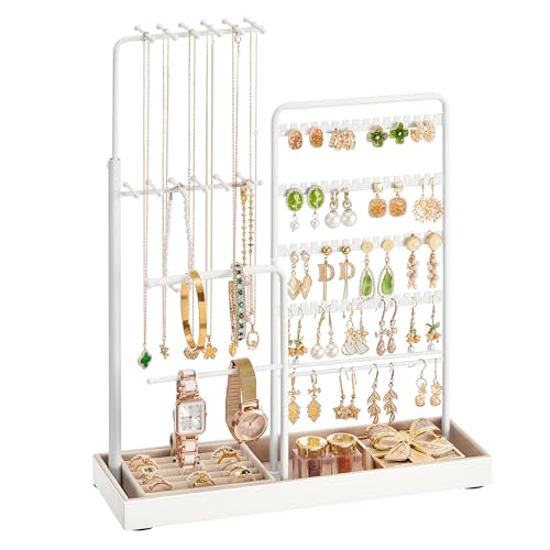 {"about_product": ["Tangle-Free Design: 3 separate racks with 2\" gaps keep your necklaces and bracelets tangle-free on this jewelry holder, while the vertical design saves space and maximizes organization", "Adjustable Necklace Holder: The necklace rack extends up to 18.7\", which is 4.9\" taller than standard holders, making it perfect for storing long necklaces and other jewelry pieces", "Versatile Jewelry Storage: Easily organize up to 46 pairs of earrings, 20 bracelets or watches, 24 necklaces, and small items like rings, lipsticks, pins, and hairpins—all in one jewelry stand", "Solid Frame, Soft Lining: The quality steel frame ensures stable support, while the velvet-lined tray protects your valuables from scratches", "Assemble with Ease, Gift with Grace: Set up this jewelry organizer in just two simple steps. Its sleek and modern design makes it a thoughtful and stylish gift for your loved ones"], "product_description": null, "product_information": {"UPC": "194343377384", "ASIN": "B0DYDQ1KW8", "Size": "3.9\"D x 12\"W x 18.7\"H", "Brand": "SONGMICS", "Color": "Pale Gold", "Shape": "Rectangular", "Style": "Modern", "Finish": "Metal", "Material": "Metal, MDF (Medium Density Fiberboard), Velvet", "Finish Type": "Metal", "Item Weight": "1.54 pounds", "Part Number": "UJJS026A01", "Manufacturer": "SONGMICS", "Mounting Type": "Table Top", "Inner Material": "Velvet", "Number of Items": "1", "Special Feature": "Adjustable Necklace Holder, Soft Lining, Tangle-Free Design", "Target Audience": "Women,Girls", "Number Of Pieces": "1", "Special Features": "Adjustable Necklace Holder, Soft Lining, Tangle-Free Design", "Best Sellers Rank": "#70,601 in Clothing, Shoes & Jewelry (See Top 100 in Clothing, Shoes & Jewelry) #96 in Jewelry Towers", "Product Dimensions": "3.9\"D x 12\"W x 18.7\"H", "Batteries Included?": "No", "Batteries Required?": "No", "Included Components": "1 x Jewelry Stand", "Date First Available": "July 10, 2025", "Jewelry Storage Type": "Jewelry Stand", "Number of Compartments": "5", "Recommended Uses For Product": "Bangle, Bracelet, Earring, Necklace, Ring"}, "product_details": {"Brand": "SONGMICS", "Color": "Pale Gold", "Shape": "Rectangular", "Style": "Modern", "Material": "Metal, MDF (Medium Density Fiberboard), Velvet", "Finish Type": "Metal", "Special Feature": "Adjustable Necklace Holder, Soft Lining, Tangle-Free Design", "Target Audience": "Women,Girls", "Product Dimensions": "3.9"D x 12"W x 18.7"H", "Recommended Uses For Product": "Bangle, Bracelet, Earring, Necklace, Ring"}}