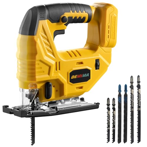 {"about_product": ["Compatibility with De-Walt 20V Battery: The Jig Saw Compatibility with De-Walt 20V Battery, Insert your own battery to start.(DCB200, DCB201, DCB203, DCB204, DCB206 etc.). Please note that batteries are not included with the cordless jigsaw.", "POWERFUL POWER AND EFFICIENT: The DEMIMA jig saw is equipped with a high-performance 800W brushless motor, which has stronger power output and improves cutting efficiency by 30%. It can easily handle a variety of materials such as wood, metal, PVC, etc., achieve excellent cutting performance, and complete professional-level tasks in one go.", "7 SPEED GEAR ADJUSTMENT: From fine carving to fast cutting, 7 speeds can be switched with one button, with a maximum speed of 3200 RPM. Low speed can stably handle fragile materials, and high speed can smoothly cut thick plates. One machine can meet all scene needs, saving time, effort and worry.", "VERSATILE & BEVEL CUTTING: It supports 45° tilt adjustment in both directions, can flexibly cope with complex angles, and easily complete bevel cutting. Versatile cutting depths of 80mm in wood, 8mm in steel, and 20mm in PVC pipe, combined with the 3-gear orbital setting, provide optimal performance for a spectrum of projects.", "COMFORTABLE AND SAFE, WORRY-FREE OPERATION: The jig saw blade set enhances your cutting experience. The non-slip rubber handle fits your hand shape, so you won't feel tired after holding it for a long time, and the control is more stable and precise. The bright LED automatically fills in the dark environment, and the cutting line is clearly visible, saying goodbye to misoperation.", "TOOL-FREE BLADE CHANGE&SAFETY LOCK: The T-shaped handle blade is quick and easy to replace without the need for auxiliary tools, which greatly improves work efficiency. The safety lock design prevents accidental start-up and ensures safe operation, so novices can also use it with confidence.", "WHAT CAN YOU GET?: 1 x Cordless Jigsaw, 2 x 3.9in Short Wood Cutting Blades, 2 x 5.9in Long Wood Cutting Blades, 2 x Metal Cutting Blades, 1 x Wrench, 1 x User Manual(Battery Not Included)"], "product_description": null, "product_information": {"UPC": "787502539404", "ASIN": "B0DYNP6X1V", "Brand": "DEMIMA", "Color": "Yellow", "Speed": "3200 RPM", "Style": "For De-Walt 20V", "Voltage": "20 Volts", "Wattage": "800 watts", "Material": "Acrylonitrile Butadiene Styrene", "Blade Shape": "Rectangular", "Item Weight": "1 pounds", "Manufacturer": "DEMIMA", "Power Source": "Battery Powered", "Cutting Angle": "45 Degrees", "Warranty Type": "Limited Warranty", "Blade Material": "High Speed Steel", "Handle Material": "Rubber", "Best Sellers Rank": "#35,568 in Tools & Home Improvement (See Top 100 in Tools & Home Improvement) #15 in Power Jig Saws", "Item model number": "JS-DW", "Product Dimensions": "9.4\"L x 3.3\"W x 8.2\"H", "Batteries Included?": "No", "Batteries Required?": "Yes", "Included Components": "Blade", "Date First Available": "February 27, 2025"}, "product_details": {"Brand": "DEMIMA", "Color": "Yellow", "Power Source": "Battery Powered", "Blade Material": "High Speed Steel", "Included Components": "Blade"}}