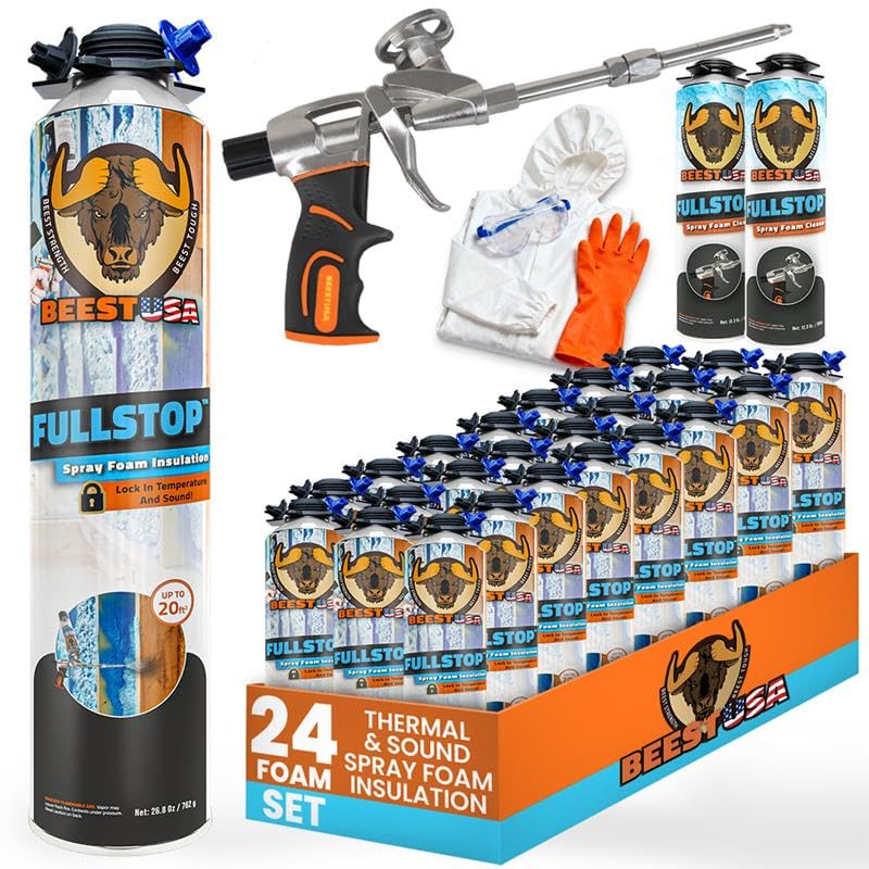 {"about_product": ["Beest FullStop DIY Spray Foam Insulation Kit: Our spray foam insulation delivers exceptional thermal insulation and soundproofing, achieving an R-Value of 8.14 with the recommended 2-inch application thickness. It is perfect for walls, ceilings, uneven surfaces, and hard-to-reach areas where traditional insulation falls short.", "High-Coverage Spray Foam Insulation Kit (480 sq. ft.): Our all-in-one spray foam kit comes with 24 spray foam insulation cans, 1 heavy-duty spray foam insulation guns, 2 powerful solvent-based spray foam cleaners, pair of glove, 1 goggle, and 1 coverall—everything you need for safe, efficient, and hassle-free application.", "Create a Well-Insulated, Energy-Efficient Home: With a recommended application temperature of 68–77°F, this hybrid one-component spray foam expands consistently to seal gaps and cracks. Its high thermal resistance ensures year-round performance, lowering energy bills and enhancing home comfort.", "One-Component, Pro-Grade Advanced Hybrid Formulation: Unlike competitors who mislabel, BEEST combines the best of both worlds: a closed-cell outer skin for strength, moisture resistance, and a high R-Value, paired with a partially open-cell core for superior expansion, flexibility, and coverage. Real science. Real results. Lasting insulation.", "Safe & Durable Insulation Spray Foam Kit: Moisture-cured and ozone-safe, this long-lasting expanding foam spray is safe for you and the environment. Once cured, it can be painted or coated to prevent discoloration and blend seamlessly with your décor", "Adaptable for All Surfaces: The innovative spray insulation foam can adhere strongly to wood, concrete, metal, glass, brick, drywall, and more. The recommended layer thickness is 2 inches, providing an airtight seal that prevents air leakage, moisture infiltration, and condensation.", "Follow Instructions for Professional-Grade Results: No contractor is required—just follow the user-friendly instructions for flawless application on walls, roofs, attics, foundations, basements, garages, sheds, balconies, trailers, boats, pipes, and storage tanks"], "product_description": null, "product_information": {"ASIN": "B0DZJ25N8V", "Manufacturer": "Petra", "Customer Reviews": "4.4 4.4 out of 5 stars \n\n (252)", "Best Sellers Rank": "#892 in Industrial & Scientific (See Top 100 in Industrial & Scientific) #4 in Urethane Adhesives", "Item model number": "B-BNDL-SFI-24PK", "Product Dimensions": "14.2 x 13.2 x 0.1 inches; 53.2 Pounds", "Date First Available": "May 1, 2025"}, "product_details": {"Brand": "BEEST", "Material": "Polyurethane foam", "Manufacturer": "Petra", "Product Dimensions": "14.2"L x 13.2"W", "Recommended Uses For Product": "Spray Foam Insulation"}}