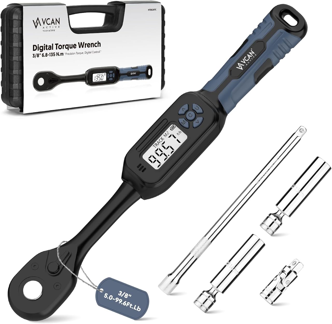 {"about_product": ["【±2% Accuracy & Large Digital Display】3/8 torque wrench digital delivers a rock-solid accuracy of ±2%. 3/8 digital torque wrench is5.02-99.6Ft.Lb After 50,000 rigorous tests, you can trust it to perform flawlessly over 30,000 uses—no recalibration needed. Get the job done right! The large LED display with auto-backlight ensures clear readings in darkness/low-light.Built for pros: rugged construction, flawless performance, and user-centric design for exacting automotive/industrial applications.", "Nice gift-Intimate Torque Wrench Set - Includes digital torque wrench x 1, Spark plug socket x2, Extension pole x 1 Universal joint x 1, screwdriver x 1, AAA batteries x 2, storage case x 1. And the extension bar help to reach awkward places. \"Ultimate Digital Torque Wrench Set: Master Bike, Motorcycle, Car, Aircraft & Yacht Repairs + Home DIY! Precision Tool for Pros & Beginners – Tackle Refrigerators, Heavy-Duty Jobs & Everything In Between.", "【Overload Protection (Audible and Visual Alarm)】:Imagine never second-guessing your torque settings again! With our clear audio and visual alerts, you’ll know when you’re close to your target.A friendly green light indicates you’re at 85% to 90% of your goal, while a reassuring red light confirms you’ve hit 100%. Effectively prevent nut stripping, protecting your nuts and ensuring a secure fit every time. Say goodbye to over-tightening and hello to precision!", "Peak & Track Modes: In Peak mode, set target torque values with audio-visual alerts upon reaching preset levels. Track mode enables real-time torque monitoring for precision adjustments. Dual-Direction 72-tooth ratchet Ratchet-Reversible ratchet head supports clockwise/counterclockwise operations, optimizing accessibility in confined spaces. Quick-Release Mechanism-Patented ratchet head features built-in locking structure allowing rapid accessory changes with anti-drop protection.", "STURDY AND DURABLE: This digital torque wrench features chrome molybdenum steel construction that resists wear and tear - and its slim, sturdy neck has been durability-tested 5,000 times to outperform bulky, traditional wrenches. The ergonomic handle feels like a natural extension of your arm during long repairs, and the built-in lanyard hole turns a cluttered toolbox into a convenient wall-mounted one - just hang and grab. it is more convenient for carrying storage and use.", "10 Preset Modes & 4 Units of Use Switching: offering 10 preset modes (M0-M9). Easily switch between N-m, kgf-cm, lb-ft, and lb-in for flexible torque measurement across different applications, all displayed on a high-definition LED screen for easy reading. equipped with replaceable accessories, effortlessly handling tasks from auto repair, bike repair, E-bike and motorcycle maintenance"], "product_description": null, "product_information": {"ASIN": "B0F4XCYCJC", "Size": "3/8\" 5.02-99.6 Ft.Lb", "Brand": "VCAN ACTIVE", "Color": "Black&blue", "Finish": "Powder Coated", "Material": "chrome molybdenum steel", "Batteries": "2 AAA batteries required. (included)", "Head Style": "Fixed Ratchet", "Finish Type": "Powder Coated", "Item Length": "12.59 Inches", "Item Weight": "3.5 pounds", "Manufacturer": "VCAN ACTIVE", "Battery Cell Type": "Zinc Carbon", "Best Sellers Rank": "#14,810 in Tools & Home Improvement (See Top 100 in Tools & Home Improvement) #29 in Torque Wrenches", "Item model number": "HT06267C", "Batteries Included?": "Yes", "Batteries Required?": "Yes", "Included Components": "1pc 3/8\" Universal Joint", "Wrench Length Style": "Standard", "Date First Available": "April 15, 2025", "Measurement Standard": "Metric", "Item Package Quantity": "1"}, "product_details": {"Brand": "VCAN ACTIVE", "Color": "Black&blue", "Material": "chrome molybdenum steel", "Item Length": "12.59 Inches", "Item Weight": "3.5 Pounds"}}