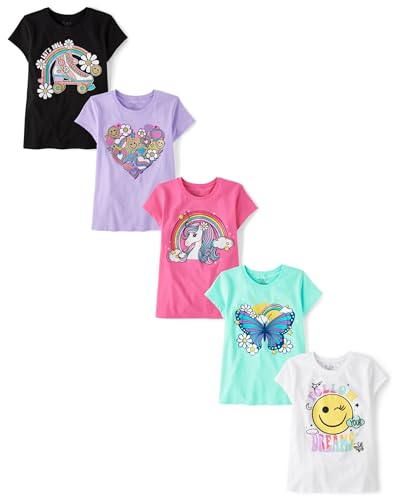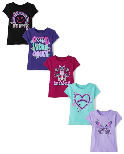 {"about_product": ["FABRICATION: 100% cotton jersey, imported", "MULTIPACK: 1 flowers graphic design, 1 'Radiate Positive Energy' with rainbow graphic design, 1 flower heart graphic design, 1 'Girls Can Do Anything' with flowers graphic design, 1 butterflies & flowers graphic design", "FIT & DESIGN: Rib-knit crew neck, short sleeves", "FEATURES: Tagless label", "THE CHILDREN'S PLACE — We offer a huge selection of kid's clothing! Shop us for jeans, shorts, leggings, chinos, polo shirts, dresses, pajamas, and accessories."], "product_description": "The Children’s Place offers a huge selection of kid's clothing! Shop us for jeans, shorts, leggings, chinos, polo shirts, dresses, uniforms, pajamas, and accessories. Made with premium quality materials at a great value. Kids clothing made simple.", "product_information": {"ASIN": "B08JJ33DYT", "Department": "girls", "Manufacturer": "The Children's Place", "Customer Reviews": "4.8 4.8 out of 5 stars \n\n (5,161)", "Best Sellers Rank": "#13,784 in Clothing, Shoes & Jewelry (See Top 100 in Clothing, Shoes & Jewelry) #28 in Girls' Tees", "Item model number": "3037073", "Date First Available": "September 18, 2020"}, "product_details": {"Origin": "Imported", "Fabric type": "100% Cotton", "Closure type": "Pull On", "Care instructions": "Machine Wash"}}