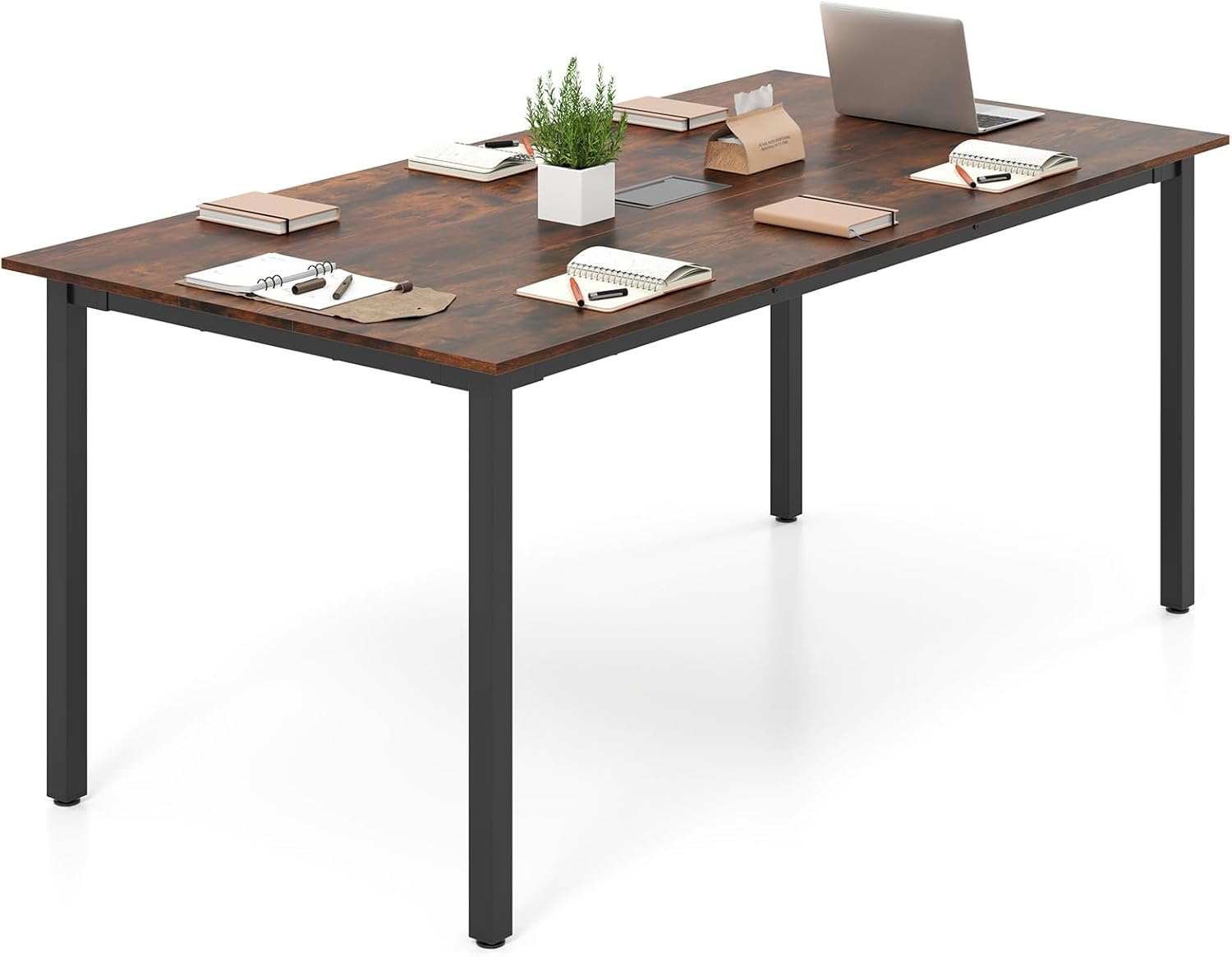 {"about_product": ["Roomy for Collaboration: Host your next brainstorming session with ease on this 6 ft x 3 ft spacious tabletop, designed to comfortably seat 8-10 of your brightest minds. With ample space for everyone, this conference table is the perfect canvas for your team’s creativity to flourish.", "Cable Chaos Tamed: Say goodbye to tangled wires and hello to a sleek, professional setup with our built-in cable grommet and cover. This smart feature keeps your office equipment’s wires organized and out of sight, ensuring your workspace looks as sharp as your business acumen.", "Strength You Can Rely On: Constructed with a robust heavy-duty metal frame, this meeting room table is a powerhouse of support, capable of withstanding up to 265 lbs. With 1.6\" thick legs, adjustable foot pads and 2 reinforced crossbars, it gives you confidence and stability in every meeting.", "Elegant & Effortless Maintenance: With a rustic wood grain finish that adds a touch of sophistication to any professional setting, this seminar table also boasts a sleek, waterproof surface that wipes clean with ease. It’s the perfect blend of style and practicality, ensuring your space looks great without the hassle.", "Versatility for Every Professional Space: Whether you’re in an office, conference room, boardroom, or training room, this versatile table is your go-to for any professional gathering. Its adaptability makes it an indispensable asset, ready to serve in any setting where great ideas are born."], "product_description": "Description:Maximize your workspace dynamics with the ultimate conference table engineered for innovation and collaboration. Bragging enough space to accommodate 8-10 dynamic minds, this 6 ft x 3 ft table is designed not only for brainstorming but for elevating the aesthetics of any professional setting with its chic rustic wood grain finish. Forget the mess of tangled cables - our savvy design includes a sleek, hidden cable management feature that will allow for tidy cable management of different devices. Constructed with a sturdy heavy-duty metal frame and capable of supporting robust discussions, this conference room table ensures every meeting is grounded in confidence and stability. Versatile enough to adapt to any professional environment, and with a breeze-easy maintenance waterproof surface, it’s truly where functionality meets sophistication. Don’t miss out - transform your meeting room into a haven of efficiency and style!\nFeatures:6 ft x 3 ft spacious tabletop boasts 8-10 people seat capacityBuilt-in cable hole with cover organizes cables of laptops, speakers and projectors2 reinforced crossbars provide strong center support1.6\" x 1.6\" thick metal legs form a reliable constructionAdjustable foot pads help adapt to uneven groundCrafted with thick boards for enduring qualitySmooth surface ensures easy cleaningAssembly neededSpecification:Color: Rustic Brown + BlackMaterial: Engineered Wood, MetalOverall Dimensions: 71\" x 35.5\" x 30\" (L x W x H)Weight Capacity: 265 lbsNet Weight: 56 lbsPackage Includes:1 x Conference Room Table1 x User Manual", "product_information": {"ASIN": "B0F8MM4Q3G", "Size": "71\" x 35.5\" x 30\"", "Color": "Rustic Brown", "Shape": "Rectangular", "Base Type": "Leg", "Top Color": "Rustic Brown", "Brand Name": "Giantex", "Model Name": "Conference Table", "Item Height": "30 inches", "Item Weight": "56 Pounds", "Manufacturer": "Giantex", "Model Number": "GX-10827-BC", "Table Design": "Conference Table", "Material Type": "Engineered Wood, Metal", "Extended Length": "71 Inches", "Handle Material": "Engineered Wood", "Number of Items": "1", "Furniture Finish": "Rustic", "Seating Capacity": "10", "Best Sellers Rank": "#180,190 in Office Products (See Top 100 in Office Products) #44 in Conference Room Tables", "Top Material Type": "Engineered Wood", "Is Stain Resistant": "No", "Frame Material Type": "Metal", "Included Components": "1 x Conference Room Table, 1 x User Manual", "Indoor Outdoor Usage": "Indoor", "Is the item resizable?": "No", "Item Dimensions D x W x H": "35.5\"D x 71\"W x 30\"H", "Unextended Seating Capacity": "10", "Maximum Weight Recommendation": "265 Pounds", "Tools Recommended For Assembly": "Screw Driver, Wrench"}, "product_details": {"Brand": "Giantex", "Item Weight": "56 Pounds", "Frame Material": "Metal", "Product Dimensions": "35.5"D x 71"W x 30"H", "Maximum Weight Recommendation": "265 Pounds"}}