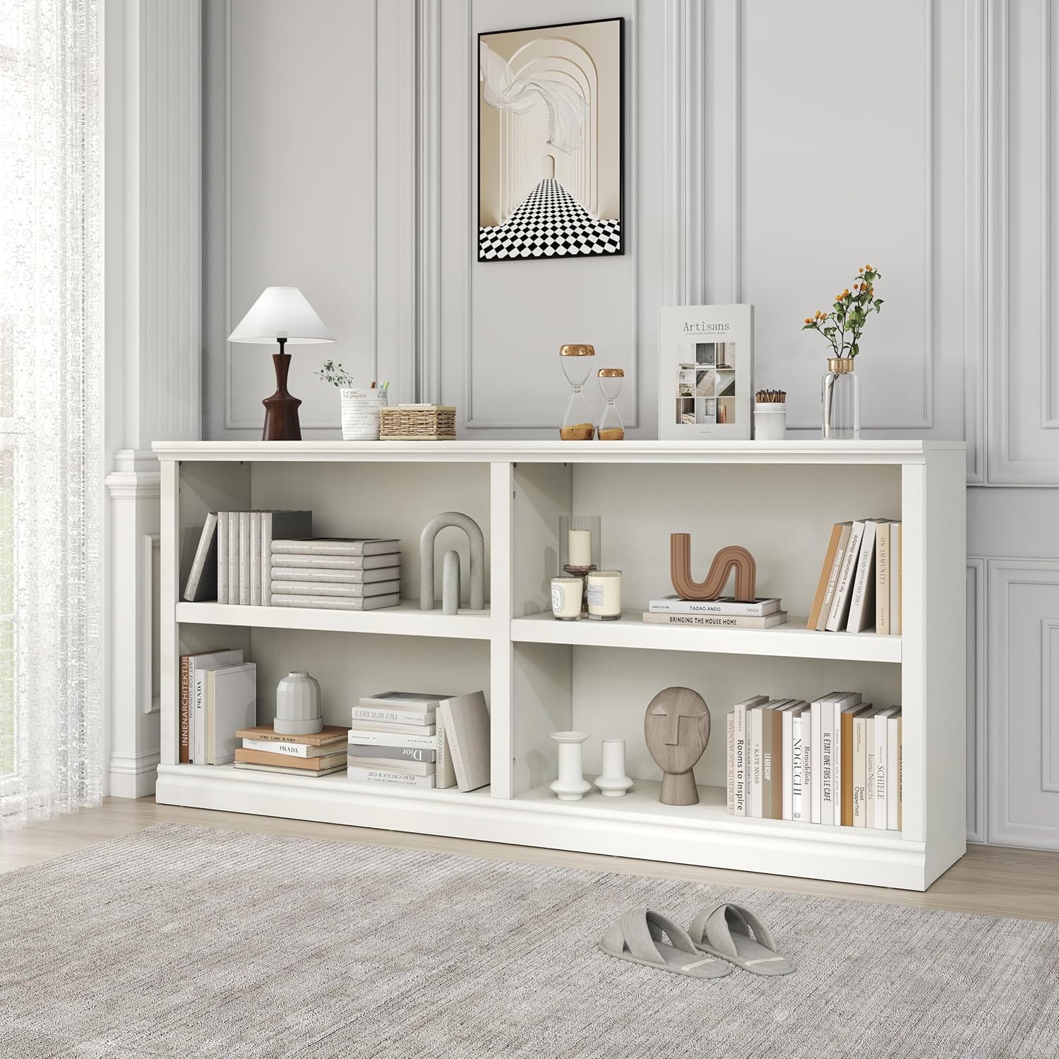 {"about_product": ["Double Space Huge Storage: Double wide bookcase in one piece, which allows you to have more space and better stability. A good looking bookcase is more important to storage more books, groceries, kitchenware, and any other stuff in your home, office, kitchen, bedroom and living room.", "Product Dimensions: A total bookcase is 13\" Depth x 64.8\" Width x 30\" Height, each Layer is 11.8 inch height for you to storage. And you can adjust 2 shelves for customizing space.", "Great Design: Our Bevfint Bookshelf is made of high quality durable engineered wood board, with technical design and strengthen screws, each board can hold up to 60 lbs weight capacity.", "Wood-like White: A white surface in wood-like pattern of a bookcase is beloved for most of home decor. It's so good to be both storage space and home decor indoor furniture.", "Instruction and High Quality Wood: You could see the installation steps on the manual and finish whole in stallation in half hour. Product made of FSC-Certified wood."], "product_description": null, "product_information": {"ASIN": "B0FGK3RLY2", "Size": "Double 2-Tier Bookcase", "Brand": "Bevfint", "Color": "White", "Style": "Modern", "Room Type": "Bedroom, Gaming Room, Library, Living Room, Office", "Unit Count": "4.0 Count", "Finish Type": "Painted", "Manufacturer": "Bevfint", "Weight Limit": "120 Pounds", "Shelf Thickness": "11.7 Hundredths-Inches", "Special Feature": "Classic Furniture", "Weight capacity": "Minimum weight: 240 Pounds", "Furniture Finish": "Wood-like White", "Assembly Required": "Yes", "Best Sellers Rank": "#232,001 in Home & Kitchen (See Top 100 in Home & Kitchen) #440 in Bookcases", "Installation Type": "Freestanding", "Number of Shelves": "4", "Product Dimensions": "13\"D x 64.8\"W x 30\"H", "Date First Available": "July 3, 2025", "Assembly Instructions Description": "Included"}, "product_details": {"Shape": "Rectangular", "Style": "Modern", "Material": "Engineered Wood", "Room Type": "Bedroom, Gaming Room, Library, Living Room, Office", "Shelf Type": "Engineered Wood", "Finish Type": "Painted", "Mounting Type": "Floor Standing with Anti Tipping Kit", "Special Feature": "Classic Furniture", "Number of Shelves": "4", "Product Dimensions": "13"D x 64.8"W x 30"H"}}