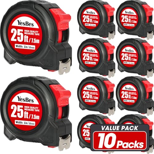 {"about_product": ["Great Value: The tape measure is about 25ft/7.5m long, and the tape blade width is about 1 inch, ideal for daily general tape measurement work", "Strong and Reliable Material: The casing of the 25ft tape measure adopts ABS high hardness plastic and TPR elastic rubber, which is wear-resistant and drop-proof, and steel is applied for the ruler belt, which is strong and flexible, not easy to break, and will serve you for a long time", "Retractable Tape Measure: the tape measure is self-locking, the blade can be extended or retracted smoothly, and it can be released and locked easily. There is a button design at the bottom, and the tape can be fixed by pressing, which is simple and convenient to use", "Satisfaction Service: If you have any questions, please contact me on Amazon, we will reply you within 24 hours and help you"], "product_description": null, "product_information": {"ASIN": "B0FH61GRHH", "Manufacturer": "YesBes", "Customer Reviews": "4.5 4.5 out of 5 stars \n\n (70)", "Best Sellers Rank": "#18,874 in Tools & Home Improvement (See Top 100 in Tools & Home Improvement) #87 in Tape Measures", "Item model number": "041ae8ea-0c3d-4e33-92c7-1ae900fa7632", "Product Dimensions": "300 x 1 x 0.04 inches; 6.79 Pounds", "Date First Available": "August 14, 2025"}, "product_details": {"Brand": "YesBes", "Color": "10 Pack", "Case Material": "ABS Plastic, TPR Rubber", "Product Dimensions": "1"W", "Measurement Accuracy": "+/- 0.03""}}
