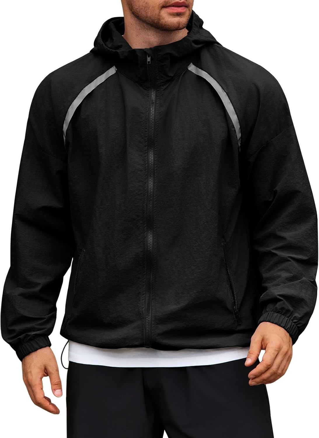 {"about_product": ["Fabric --- Our full zip jacket, crafted from high quality windproof fabric, is lightweight, breathable, quick-drying, and durable. The back ventilation system boosts breathability, keeping you cool and dry", "Handy Features --- The hooded track jacket boasts a full zip, multiple pockets (two side and one back), reflective stripes, elastic sleeve cuffs, and a drawcord-adjustable hem to keep you dry", "Reflective System --- Reflective stripes and a reflective logo design keep you safe in a low-light environment. This is a great all-around windbreaker and raincoat, that's perfect functional rainy-day or casual wear", "Occasions --- This lightweight athletic jacket features a timeless, versatile fit. Ideal for cycling, running, hiking, travel, jogging, exercise, workout, fishing, mountain biking and other outdoor activities", "Do not iron—this can damage the waterproof coating. This versatile cycling rain jacket perfect for all year around. Refer to our size chart for the perfect fit"], "product_description": null, "product_information": {"ASIN": "B0FHPZP5CB", "Department": "mens", "Customer Reviews": "4.4 4.4 out of 5 stars \n\n (40)", "Product Warranty": "For warranty information about this product, please click here", "Best Sellers Rank": "#282,354 in Clothing, Shoes & Jewelry (See Top 100 in Clothing, Shoes & Jewelry) #208 in Men's Active & Performance Shell Jackets", "Item model number": "J8V186", "Date First Available": "July 16, 2025"}, "product_details": {"Origin": "Imported", "Fabric type": "100% Polyamide"}}